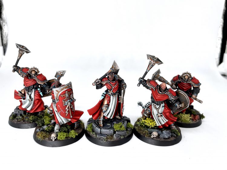 I knocked out the trio of Easy to Build Sequitors because I figured they'd be a good testing ground for the red robes I'd be painting on other models in the set. They also look cool as hell. I had to flesh them out to a legal unit with an eBay purchase of two more Sequitors, but it's no big deal. I used some spare Dominion heads because they're just such good sculpts and I didn't want the bits to go to waste.