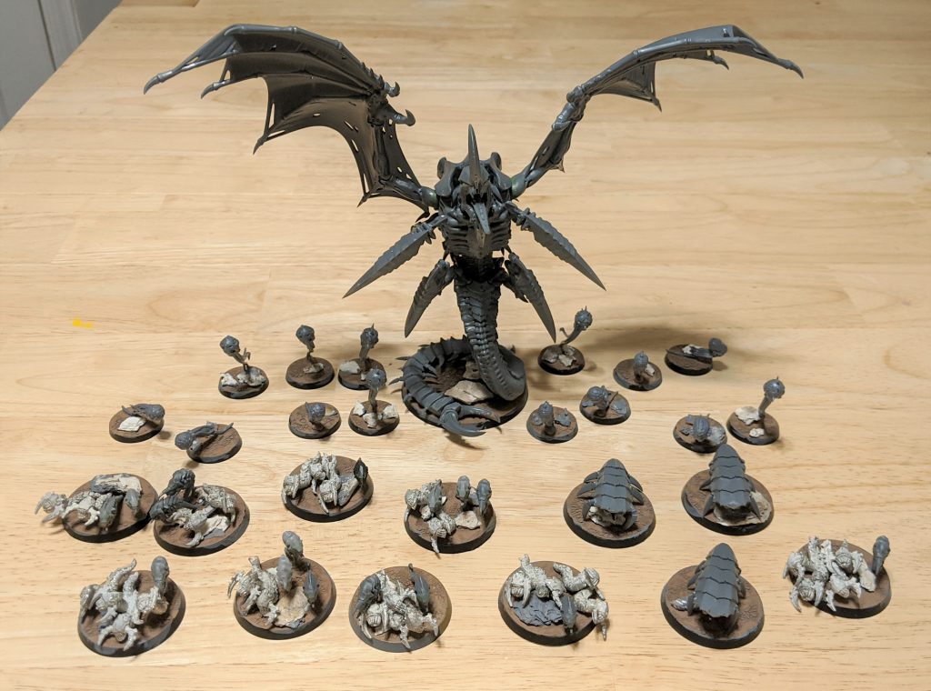 I'm bringing Tyranids to NOVA, which means I have roughly 8 months to get 2000 points done. To motivate myself even further I've teamed up with Greg and Evan to do our Path to Shame series, where we randomly roll on tables to determine what unholy combination of pain and suffering I'll get to field. So far my initial army is a Hive Tyrant, 12 Ripper Swarms, and 12 Spore Mines for a total of 480 points. Yes, really. Fortunately Hive Tyrants and Ripper Swarms are a core part of nearly any Tyranid army, and Spore Mines paint up pretty quickly. The good news is that to maintain my schedule I'll need to finish up everything by February. The bad news is that so far I've finished: