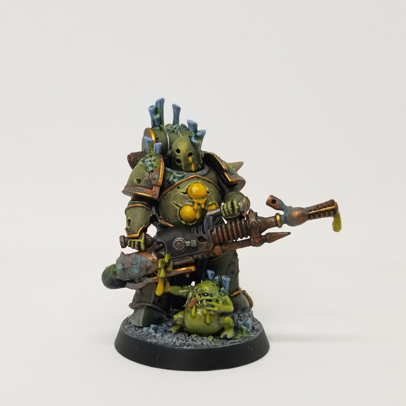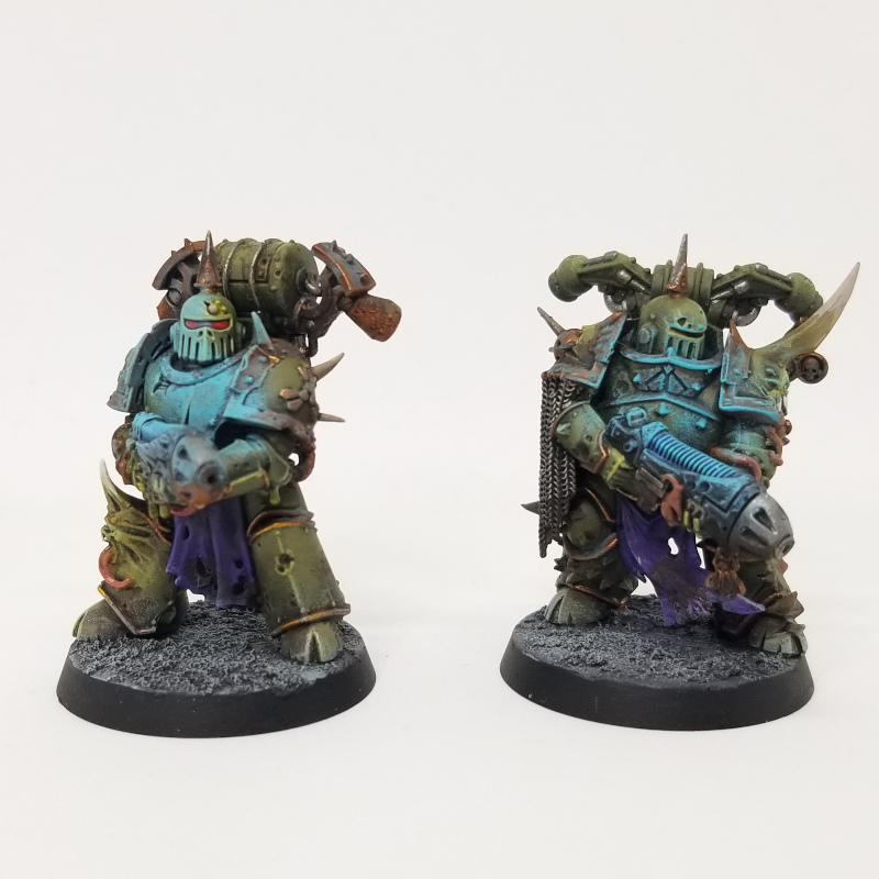After a lot of talk about painting up Emperor's Children, I painted two of my painstakingly-converted Noise Marines and then... started painting Death Guard. These guys have been sitting on my desk for a few months since their release, and I love the Heroes models so much I though it was a crime not to paint them. Death Guard paint up surprisingly quickly for me and I'm happy I was able to finish off the whole squad plus a couple of stragglers I got from a buddy in a trade for some bits. Don't tell anyone, but I maaaay be working on building out my Death Guard army and getting up to some Great Unclean One/Blight Hauler shenanigans.
