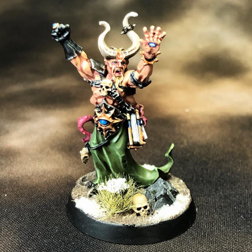 Chaos Warriors. Credit: SRMAbout this point I realized my brush was splitting in half and I had to wrangle it pretty hard to get anything resembling a fine line. However, my month wasn't done! After working with Ellar on entirely too many words about Slaves to Darkness in our Battletome Analysis article, I decided I needed a Sorceror Lord. I didn't find any of the easy plastic options appealing - they all lacked the bulk and heft I would expect an especially powerful devotee of Chaos to have. With that I searched eBay and found the Games Day 2010 Chaos Sorceror, who had the exact "Muscle Wizard" aesthetic I was looking for! With that I sat down and knocked him out in a day: