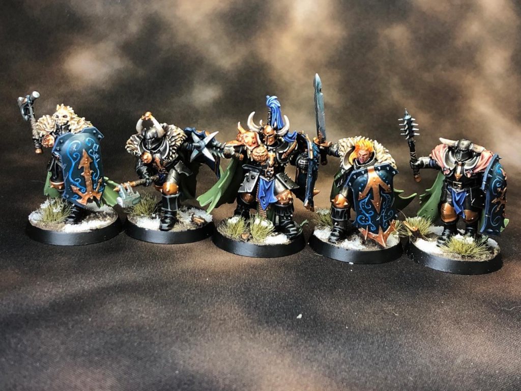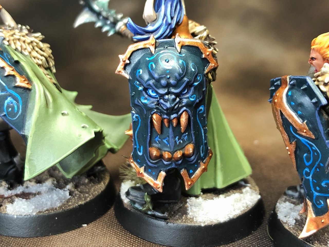 Chaos Warriors. Credit: SRMAll of my Chaos Warriors also have some Celtic-inspired woading on their shields. I tried it on the armor of one dude and he looked way too busy, but I'm especially happy with how it came out on the unit champion's shield: