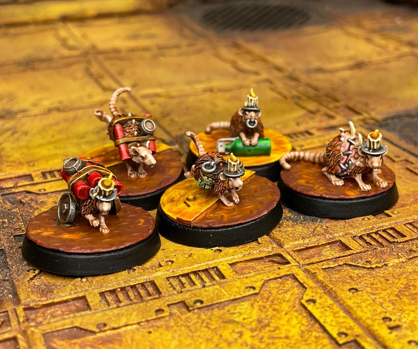First on the docket are the adorable Bomb Rats from Forgeworld. I painted these in a evening with mostly Contrast and am very happy with them considering they may never see the table (though we are looking at houses ruling their cost).