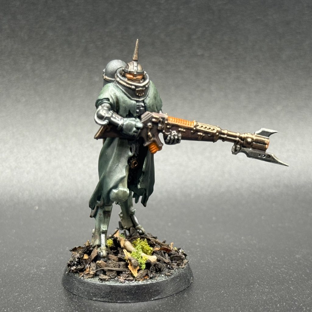 The melee options are pretty interesting. The standard weapon is the Auctorit Sceptre. This has an unimpressive profile, hitting at S4 AP4 D1 with Breaching 6+. However, it is an Icon of Authority, meaning that if your Marshal selects it to fight with, all Skitarii in their unit immediately lose any Pinned, Suppressed and Stunned Tactical Statuses they may have. The timing of this means your unit will have cleared its status in time to not suffer the penalty to Initiative. It doesn’t help with being Routed though, doesn’t let you charge if Pinned and doesn’t remove any new statuses the unit might gain in combat. The risk is that you clear your Stunned status but then lose the subsequent fight vs someone with scarier melee weapons, ending up Routed.