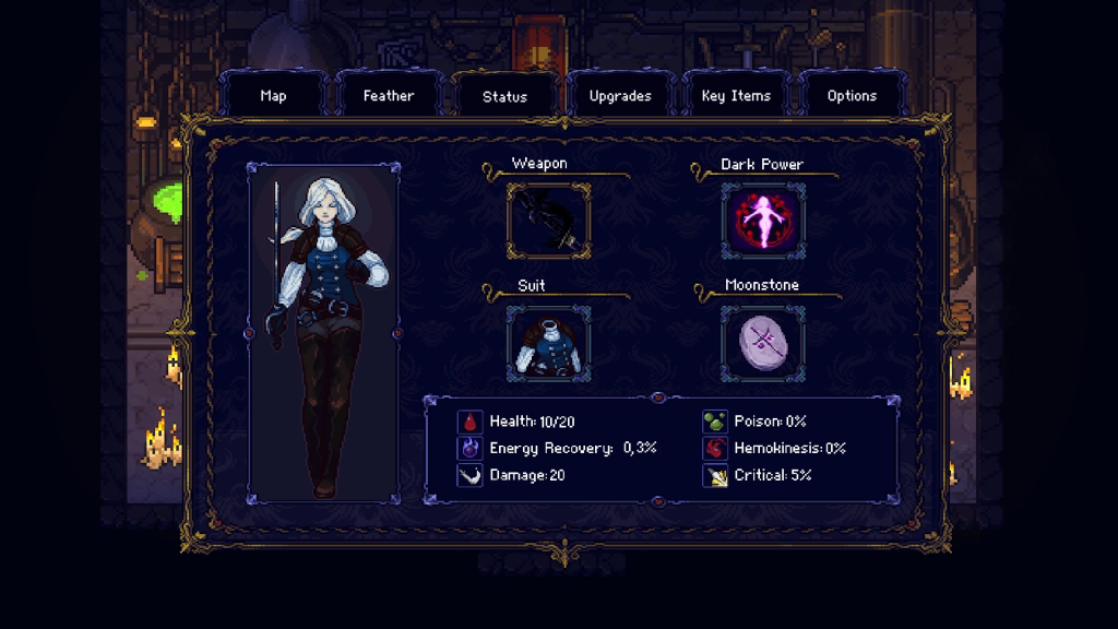 On the visuals & sound front, they’re great. I’m a hopeless sucker for sprites, and this game delivers on them with great design, fluid animation, and a charming look. Bosses vary from Big Zombie Wolf to Burned Witch At the Stake Whose Chained Heart You Must Destroy. It’s suitably gothic, and they nailed the vibe they were aiming for.