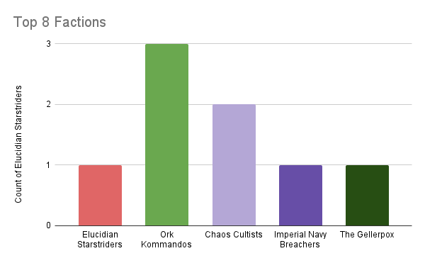 - Analyzing the top 8 shows us how 6 melee factions were able to pass, beating the average (3 orks, 2 cults, 1 gellerpox).