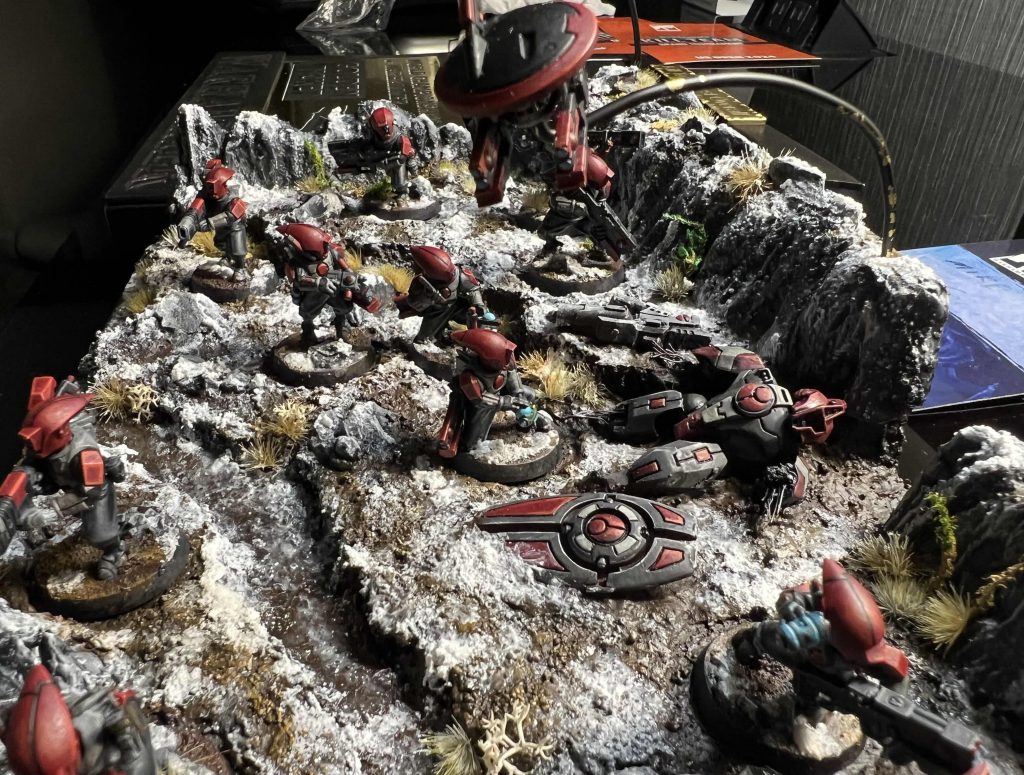 It was the top of Turning point 2, and he'd made the first move (with AWC) to kill off my Transpectral Interference Pathfinder and my Assault Grenadier who had +1 APL, except the assault grenadier was in medic range. The Grenadier ignores negative APL modifiers, so even at 1 wound he was able to activate, move forward, and use Reposition to slip through an open door and past engagement range to go into a room, use the fusion grenade to kill a pathfinder on the objective, and then secure it. This move definitely won me the game.