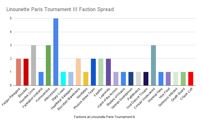 Faction spreadThe overall layout of the meta in France sees the ever reliable Intercession Squad take up the largest share. Combined with Legionary and Phobos, about a quarter of the player base continues to don power armor to take to the killzones. Overall it’s great to see a decrease in the Ork spam that plagued the last few months, and see 24 of the 27 bespoke teams represented in 40 players.