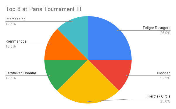 Top 8 SpreadHowever the top eight tells a different story, with a large conversion rate of the Fellgor and Heirotek Circle players over the six rounds of gameplay, though there are surprise visits from Farstalker Kinband, a team that many think need more help, and Rapid Durable Intercession Squad showing the Elites can still tango. It's great to see the Q1 dataslate making some actual changes to the meta, but it does seem that Fellgor are still on the watch list!