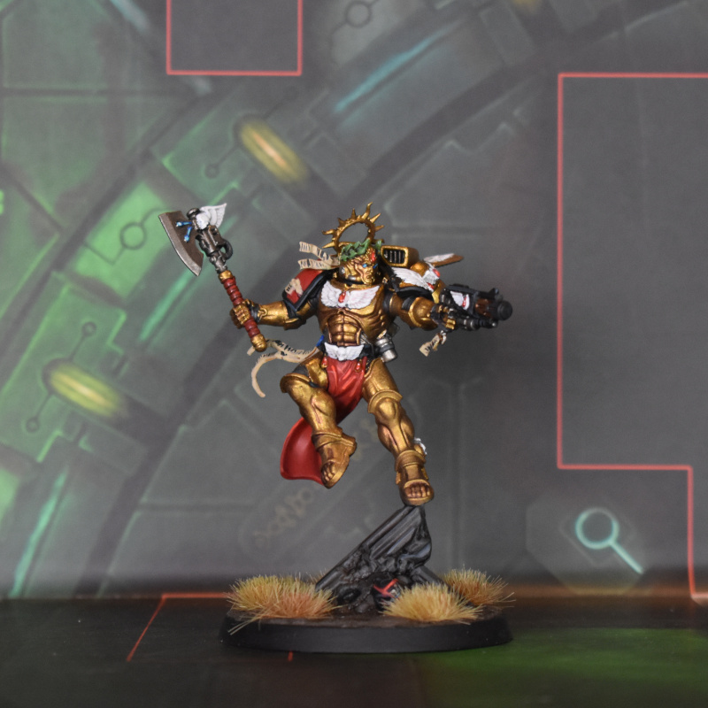 Commander Dante. Credit: CorrodeThe nice thing about Dante is that most of the model is gold. Darkstar Regency Gold with a thin wash of Druchii Violet in the recesses does the job for me. The other big area is the white, which is not a colour I love painting, but it's a nice contrast against the gold so I decided to commit to it. Vallejo Model Colour White did the job for me here, as a white that actually covers well. Beyond that it's all just GW paints, the ony notable one of which is the Word Bearers Red for the handle of the Axe Mortalis, which gives it a nice deeper, darker tone than the gems and loincloth/shoulder pad.