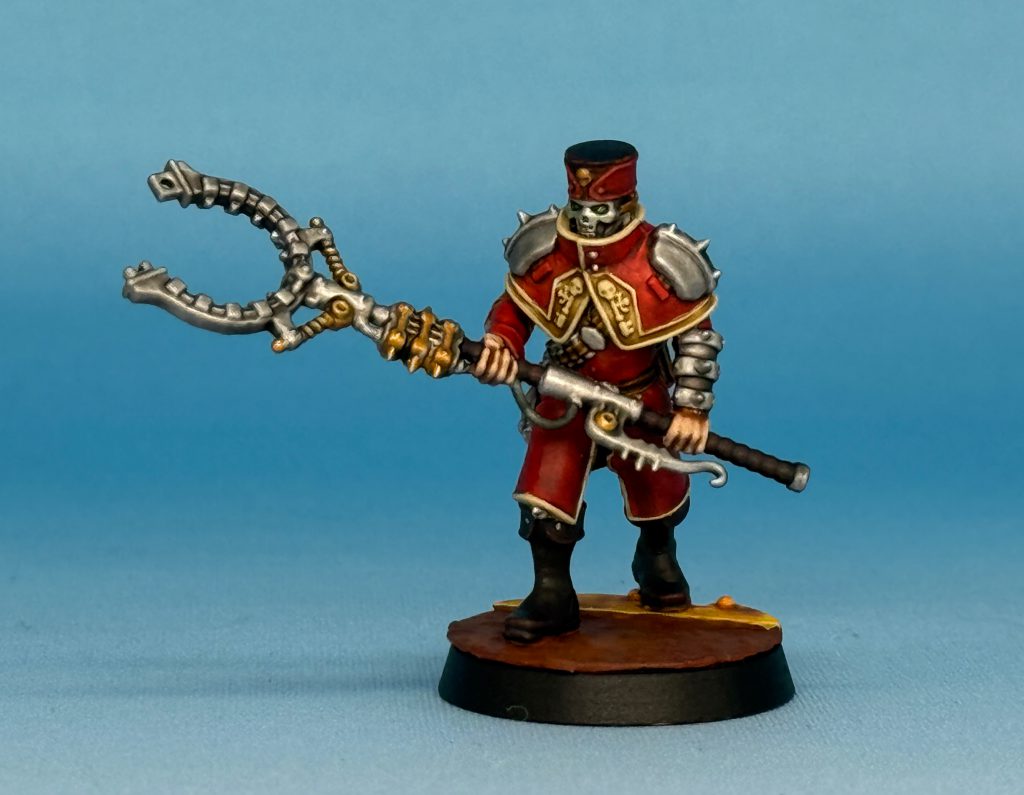 I used my typical undercoat, Army Painter Leather Brown Spray with Army Painter Skeleton Bone zenithal over top, then dry brushed white. The coats are Blood Angels Red with a glaze of Skeleton Horde. Skeleton Horde is also used for the edging. It made that step easy because I didn't have to be careful, just slopped it all over the jackets. Boots, hats and leather grips are Cygor Brown and belts are Snakebite Leather. Exposed skin was done in Guilliman Flesh. Metals with Army Painter Plate Metal and Citadel Retributor Armor, then washed with TTC Black Wash. Finished them off with a quick glaze of the eye sockets with Warp Lightning (was going for a lens effect) and some 'Ard Coat. Painted up the bases and into the Lightbox!