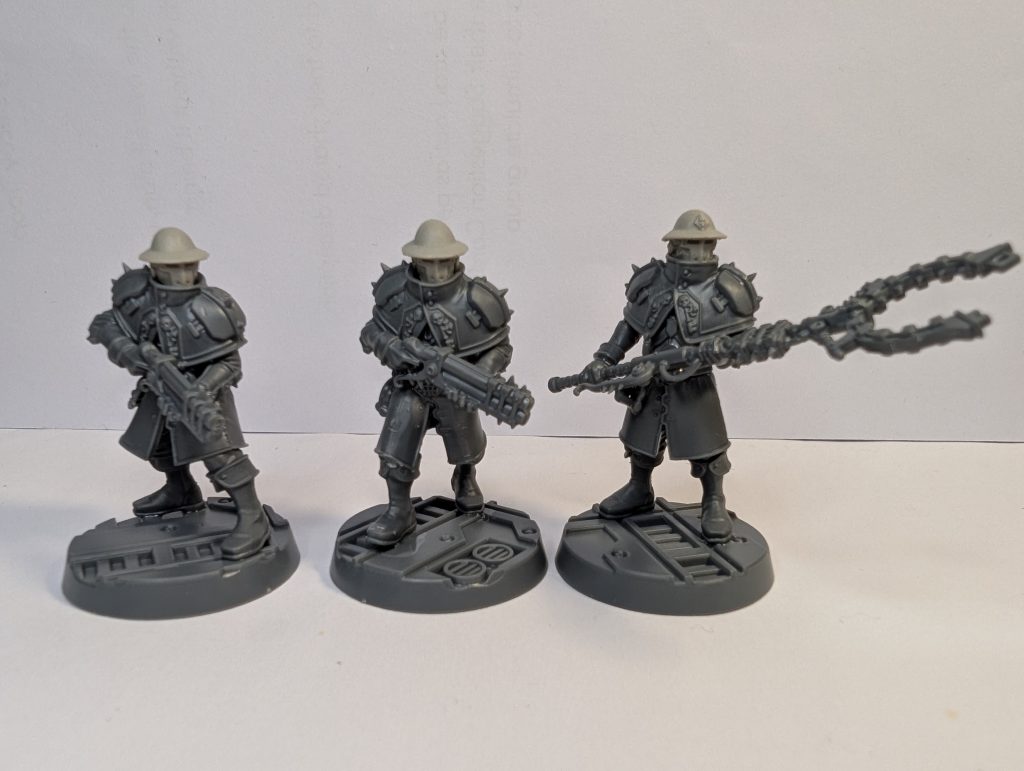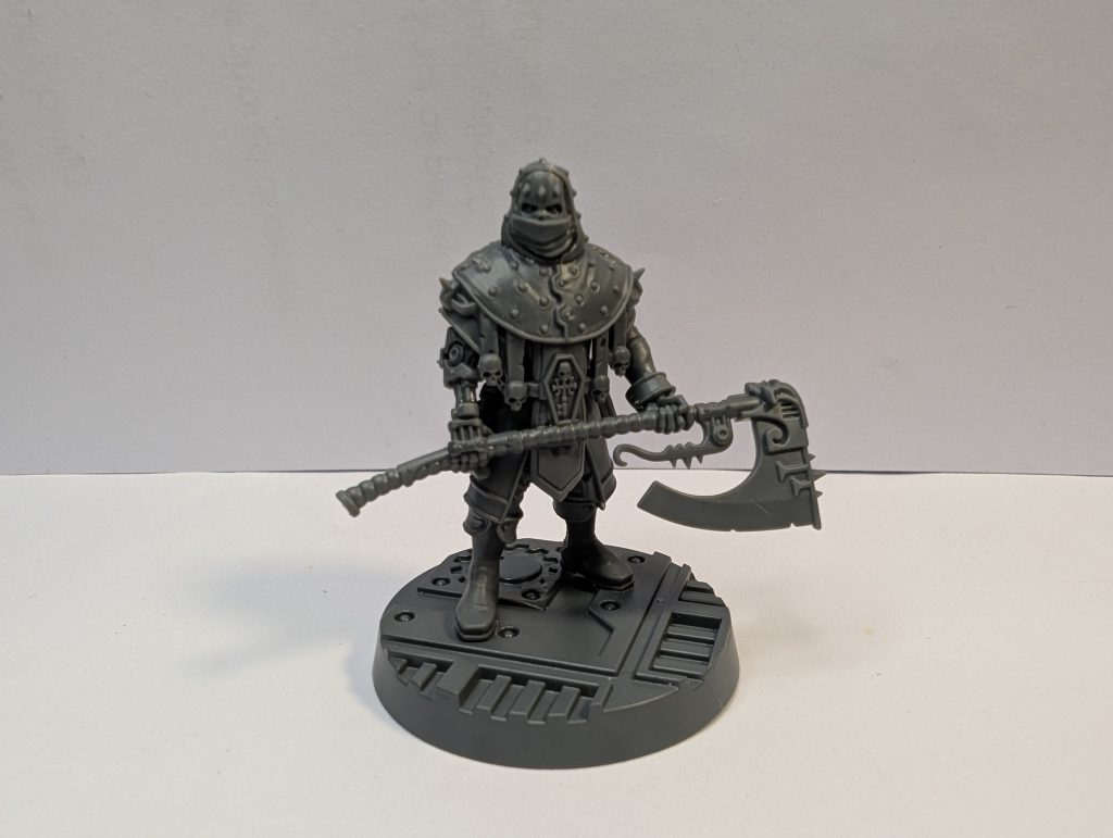 An imposing silhouette for the Executioner. Credit: Genghis CohenThe assembly guide is accurate, but not in colour as with some kits. These models are of medium complexity, nothing unusual for modern GW. All 5 models are 3 pieces for the body and legs, then a design where the mantle comes in two halves, front and back; the back is stuck to the assembled body, forming hollows for the arm/shoulder joint, and the front is stuck on after the arms. This gives a very firm join and makes it easy to achieve the intended pose. There tend to be 2 individual arms plus a weapon/hand bit for each model; it looks a little bit fiddly, but with shaped connection points, they went together absolutely fine. Overall you’re looking at 9-10 pieces per model plus a few optional accessories. As with most modern Necromunda kits, the trade-off is that each model’s head, arms etc fit just right in one specific pose. There is very limited scope to move the position of the arms or head to alter a model’s attitude - you could do it with a little shaving down of the connection points and/or filling armpit gaps with putty, but it’s not enabled by design.