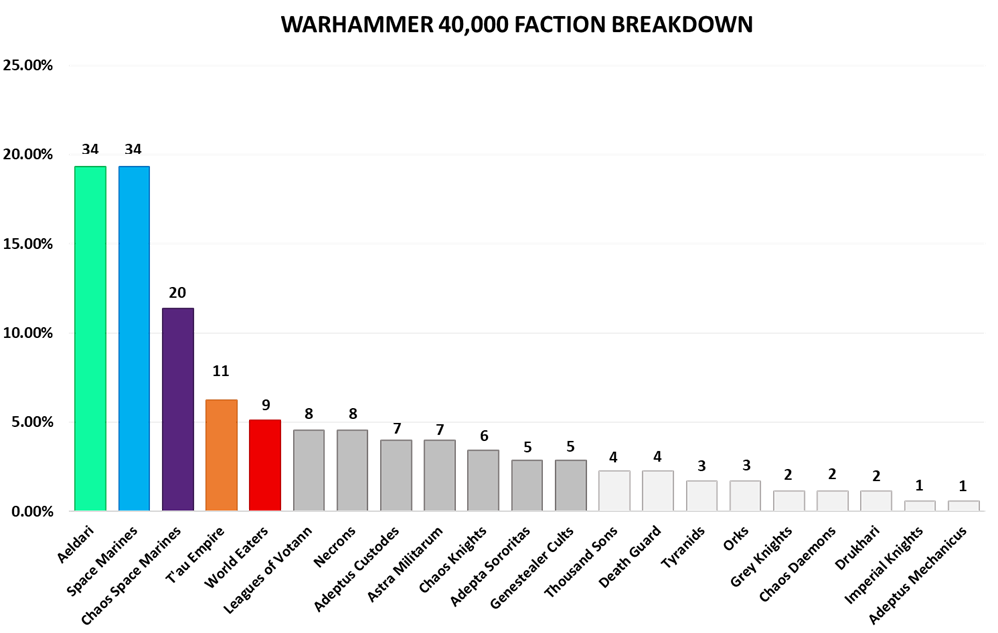 WCW Factional RepresentationEvery 40k faction will be represented at the World Championship. If you have been paying any attention at all to the Warhammer 40,000 meta, you could have probably guessed the three most common factions we’d see. At the top of the board are Aeldari, Space Marines, and Chaos Space Marines. Rounding out the top five are the Tau and World Eaters. In total and individually, these five factions are overrepresented and will comprise 61.3% of all factions played at the event. The next seven factions; Leagues of Votann, Necrons, Adeptus Custodes, Astra Militarum, Chaos Knights, Adeptus Sororitas, and Genestealer Cults are slightly underrepresented and individually make up between 3% and 5% of played factions and combine for 26.1% of played factions. The final 9 factions represented contribute 1-2% of total representation at 12.6% and are Thousand Sons, Death Guard, Tyranids, Orks, Grey Knights, Chaos Daemons, Drukhari, Imperial Knights, and Adeptus Mechanicus.