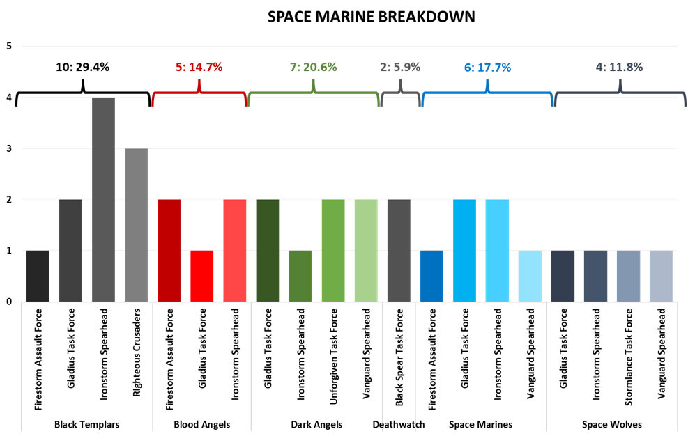 WCW Space Marine BreakdownSpace Marines being a popular faction is a surprise to no one, and they are tied with Aeldari as the most popular faction at the event. With a new book and a bevy of detachment options as well as their traditional chapter options, Space Marines will have a variety of looks and play types to offer opponents throughout the event. Here we can see the cross-section of those chapters selected by the attendees of the event, most prominent of which are the Black Templars followed by Dark Angels. In terms of the detachment types, the standout favorite is the Ironstorm Spearhead, accounting for just a hair under one-third of all detachments. Gladius is the second most common detachment followed by Firestorm and Vanguard as third most common.