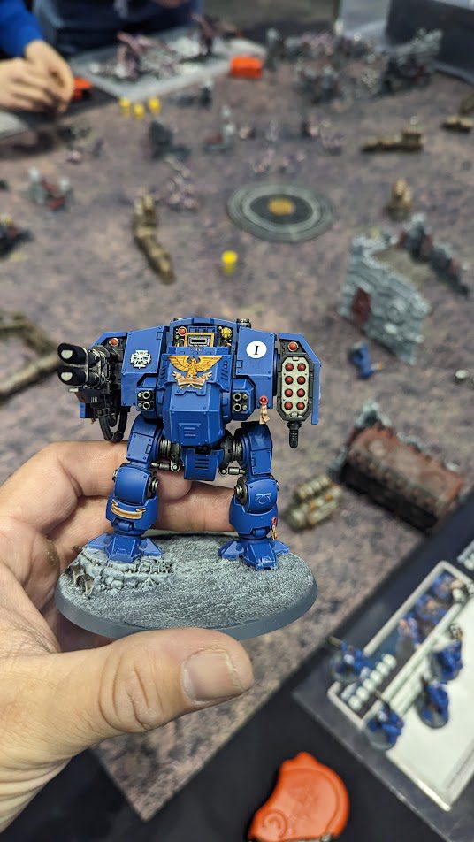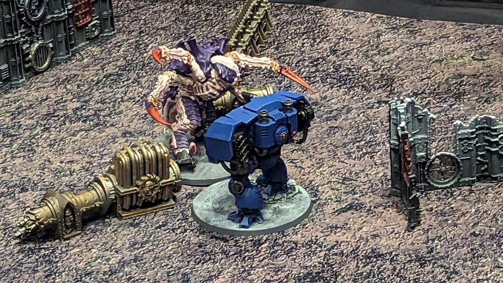 Model Credit: Games Workshop. Photo Credit: Kevin StillmanI moved my Ballistus Dread into position just behind the Screamer Killer locked in combat. While there will likely be stratagems and other rules allowing you to disengage and shoot (Editor's Note: Like the Combat Doctrines detachment rule recently previewed on Warhammer Community), those were not available to us for this demo, so Yvonmukluk pretty much could only leave his dudes in combat.