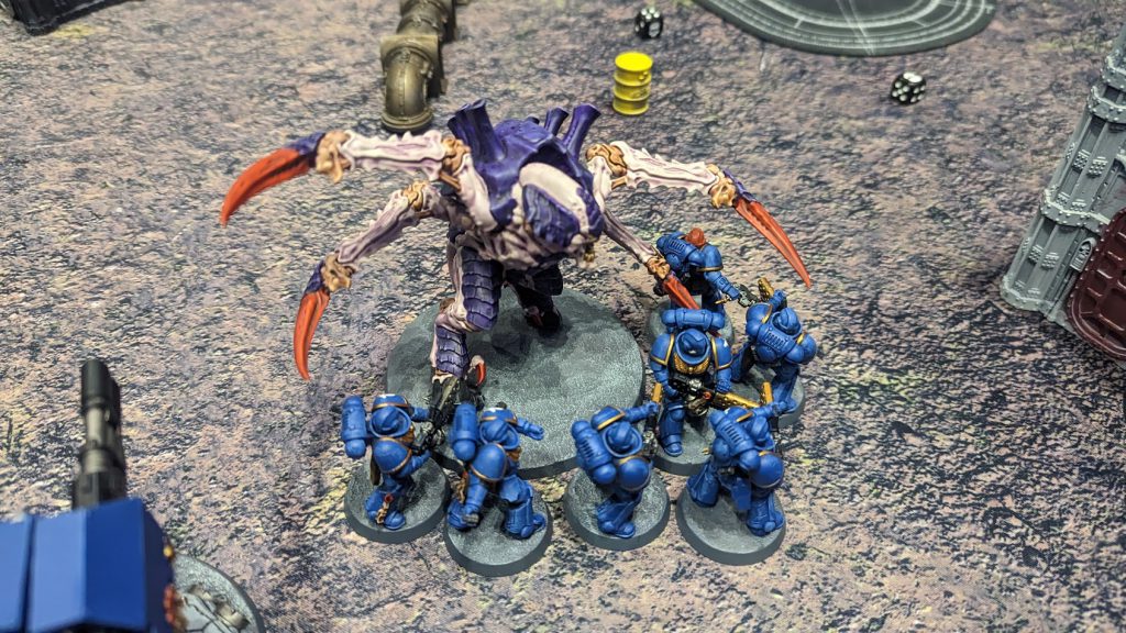 Model Credit: Games Workshop. Photo Credit: Kevin StillmanThe Screamer-Killers both fired their plasma barf ability at the Infernus Marines. This was d6+3 attacks (and I think the result this time was a total of six) at a respectable strength 8 with AP -2. After saves, this barf only did one damage to the Marines we were using, but did force a Battleshock test. As our units were Ld 6+, we needed a six or higher on the test.
