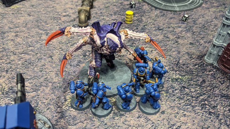 Model Credit: Games Workshop. Photo Credit: Kevin StillmanIn combat, the Screamer-Killer had 10 strength 10 attacks at AP-2, each of which came in at 3 damage and hit with WS 3+. Terrifying, right? While I didn't see the specific dice rolls, I do recall my partner having to make 5 5+ saves and only failing two - so only three Marines died to the Screamer-Killer. On the hit-back, Yvonmukluk had 21 normal Space Marine attacks. He scored a ton of his hits, but against a monster with toughness 9 he only managed two wounds, both of which were easily saved.