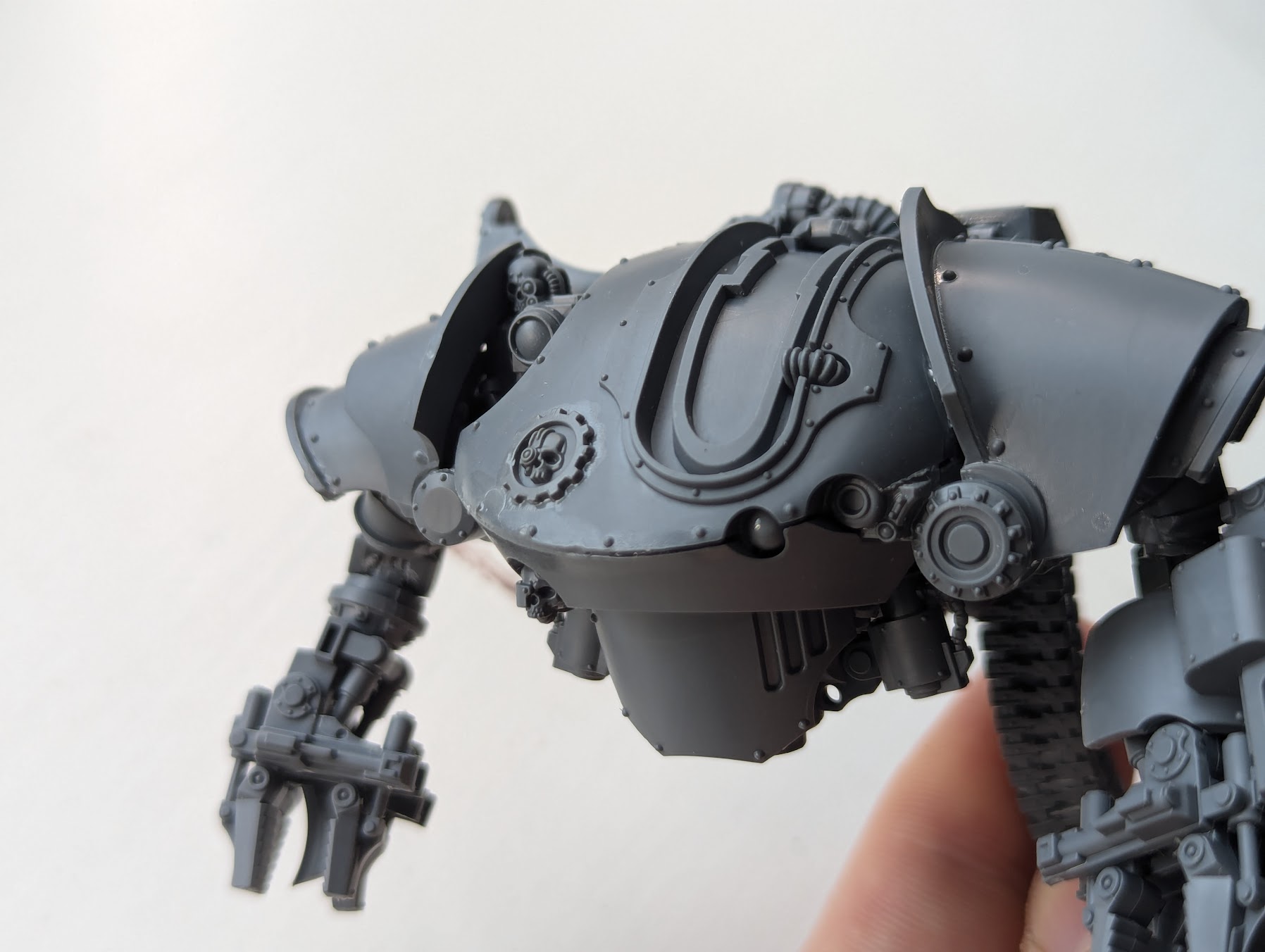 When building the kit, I would suggest keeping the feet and the hip socket pieces completely unglued, so that you can figure out your pose nearer the end. When it comes time for painting, I’d suggest subassemblies to keep things simple. While you can’t leave all the armour plates off like you would with a Titanicus Titan, you can leave some of them off. I also kept the arms, ammo feed torso, mortar and faceplate separate for ease of painting.