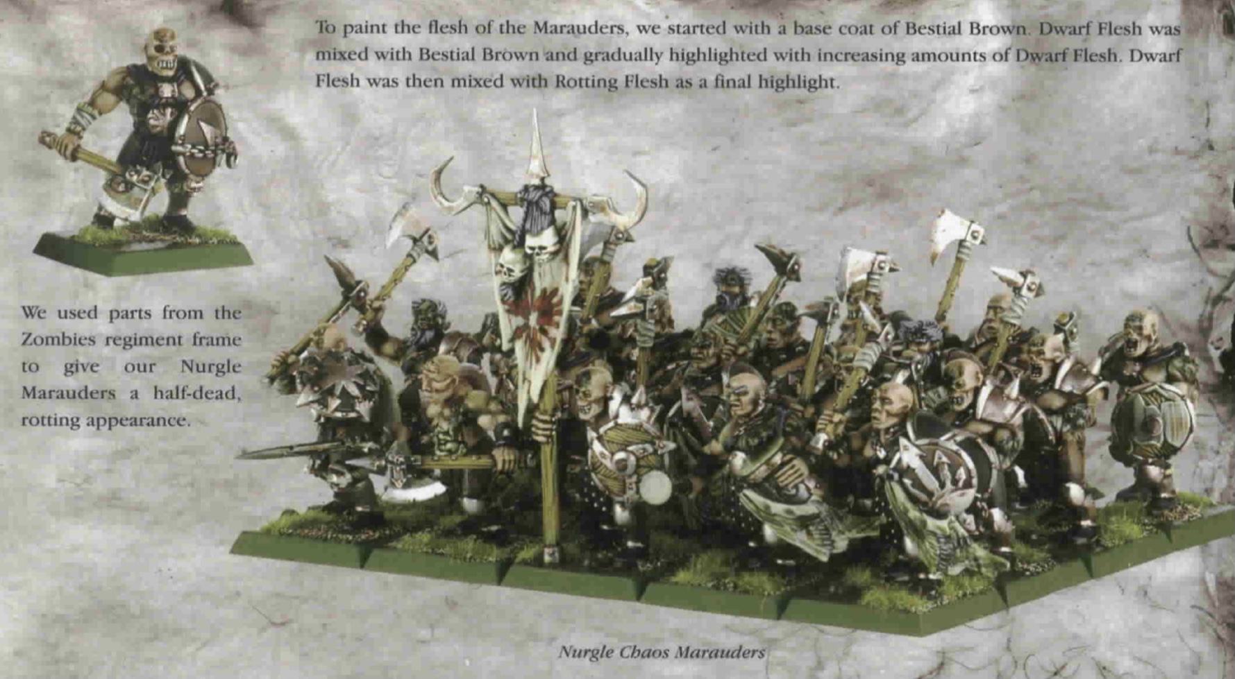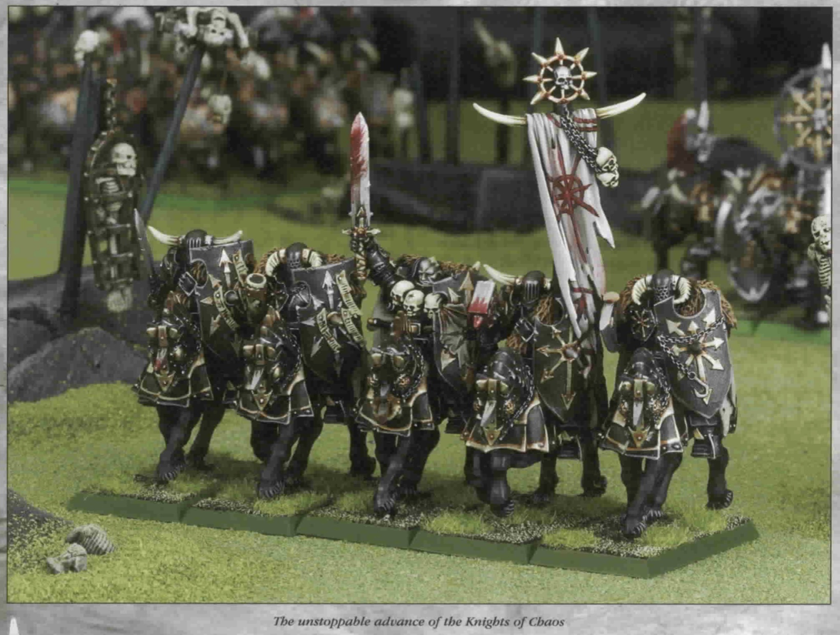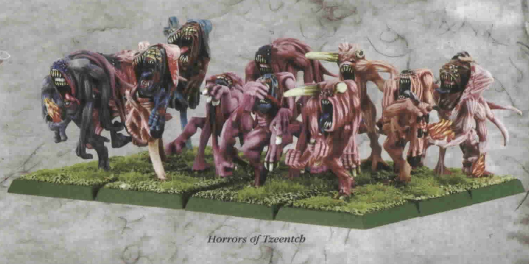 This Army book coincided with a refresh of a good part of the model range. All the lesser daemon units received new models. Of the mortal units only the Warriors of Chaos (redone in 2004 for Storm of Chaos) and the Chariots of Chaos (not to be redone until 2013 for eighth edition) had older models still; both were introduced in 1997 and 1998 respectively, with the 5th edition Realm of Chaos army book. Marauders make their debut in plastic at this point. Amazingly, this kit is still used in AoS today! Some of my favorite models from this range are the Knights of Chaos, the Marauder Horsemen, and Horrors. These knights are just your classic Chaos Knights, well proportioned with interesting details. The Marauder Horsemen look like they rode right out of Conan. Horrors of Tzeench rank among my favorites because these models exude chaos. Their sculpts appear to be frozen in mid mutation. Many of the metal models of this era have a certain amount of character to them that gets lost in later plastic updates.