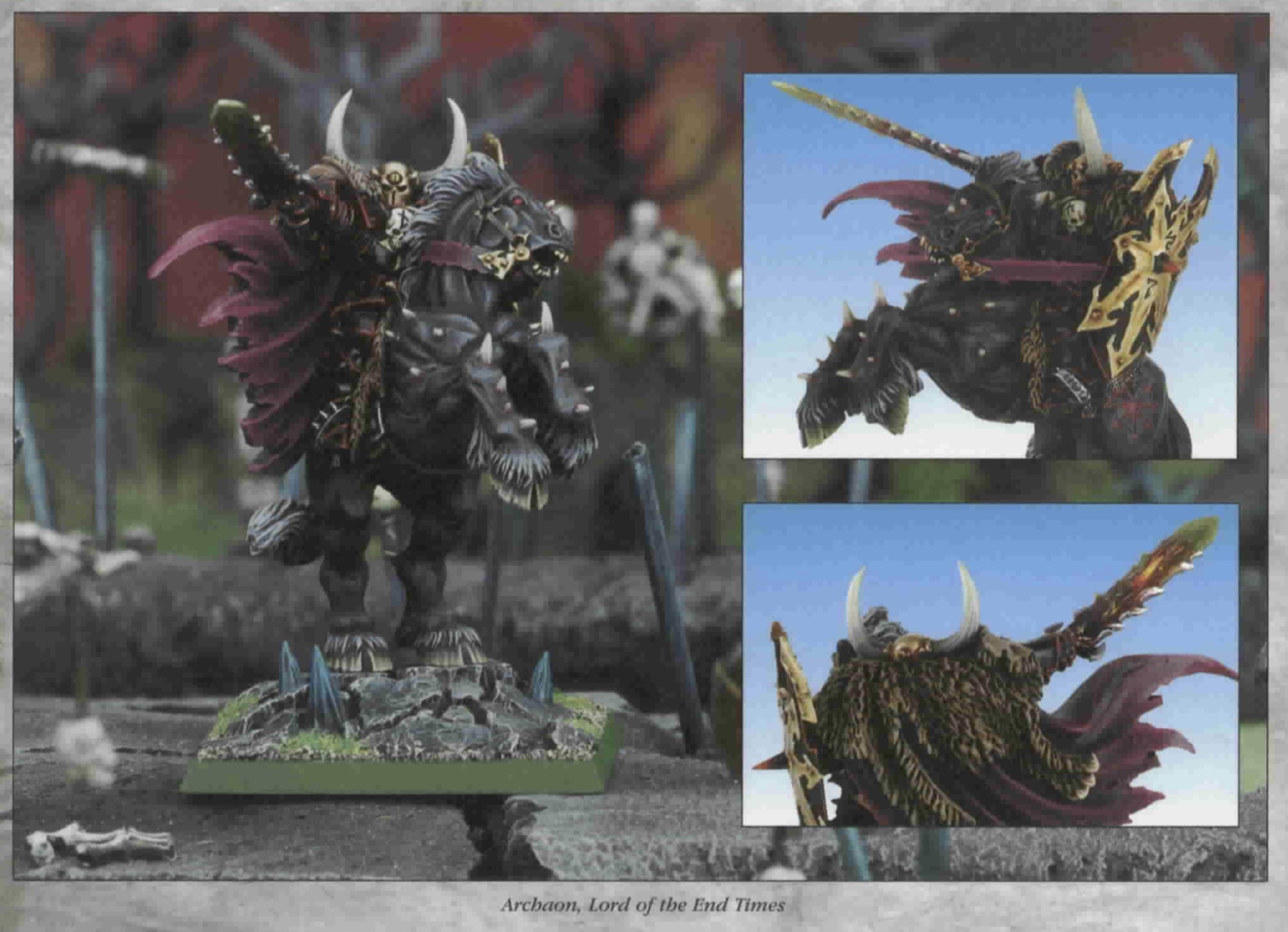 Archaon comes in at a whopping 855 points. He rides a Demonic Mount that has an additional attack and an additional point of leadership. His stat line is similar to a Lord of Chaos but with improved weapon and ballistic skill, an extra wound, one less point of initiative, and plus one leadership. The magic items he comes with grant a 1+ armor saving throw (never reduced to less than 3+) , the ability to double his attacks for one close combat phase (but rolls of one will strike himself or friendly models), a re-roll on break tests for friendly units within 6", he causes terror in enemy units, and finally, a 3+ ward save.