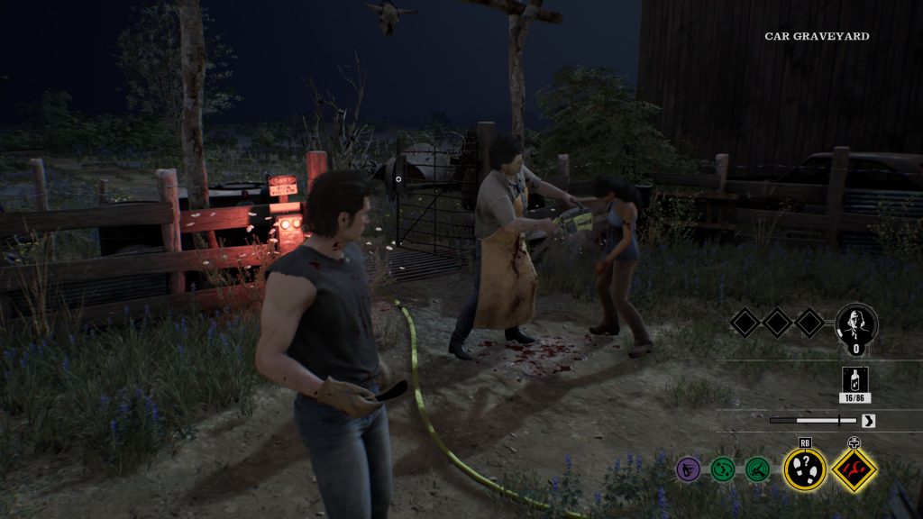Josh: Dead By Daylight is the only reasonable game to compare this too, and it isn’t really a fair comparison. I think they are separate enough games that share a singular premise / gameplay angle. Asymmetric cat & mouse gameplay.Dead By Daylight is by large a more balanced experience (over 5 years of active development will do that) and overall a more cooperative experience. You’re rewarded for helping your teammates escape, there are gameplay benefits to assists. In TCM, the only people really working together are the Family. The Victims largely help each other by virtue of simply being on the same team with the same goal – there’s no incentive to try and meddle with the Family killing your friend. In the same case, there’s not much Victims can do to help eachother. Leland can knock someone down, and everyone can stab the Family in the back if they feel up to it, but other than that you’re really all just rats scurrying in the same direction.