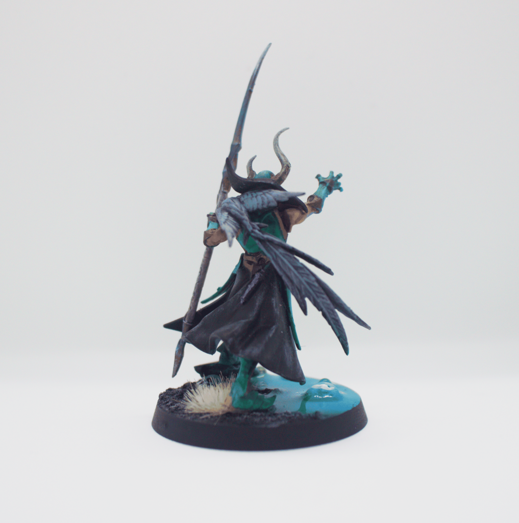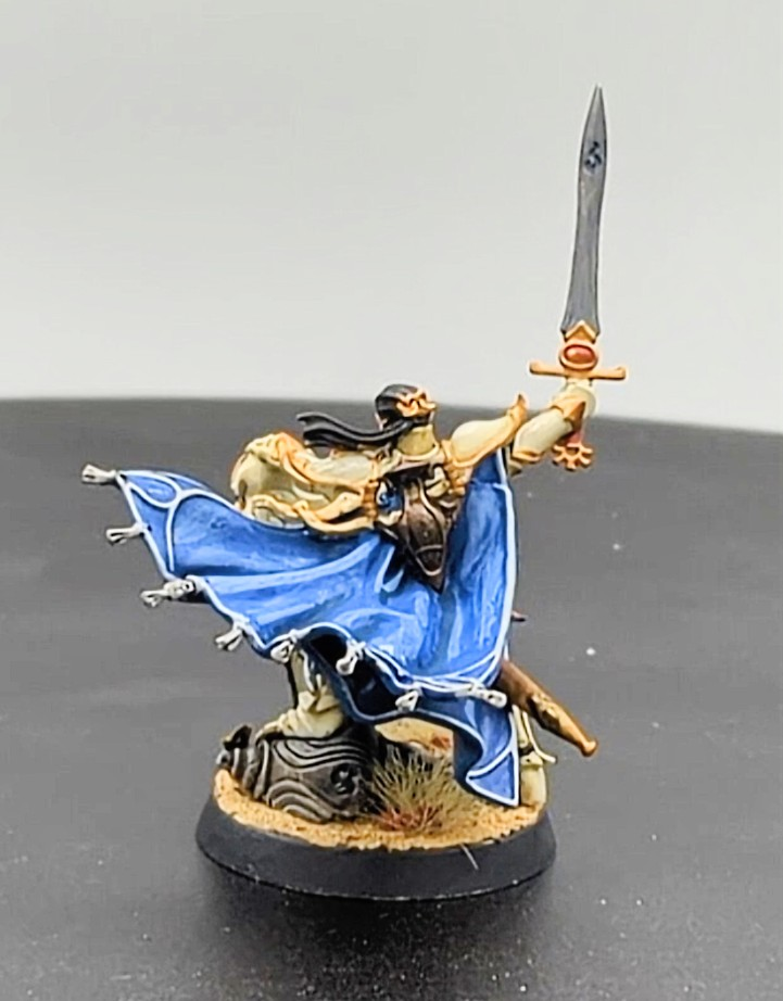 I went with an attempt at the box art scheme for this one. I base coated the model with Citadel’s Ushapti Bone, hit the recesses with Citadel Skeleton Horde thinned down and then hit the highlights with Wraithbone. For the cloak I just used Thousand Sons blue and mixed with white-grey for my highlights. The gold started at a dark brown to establish an undertone and then I layered gold on top of that.