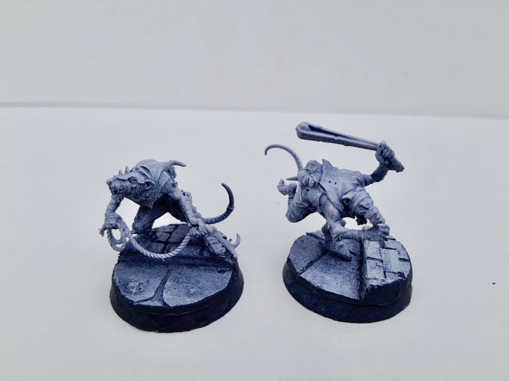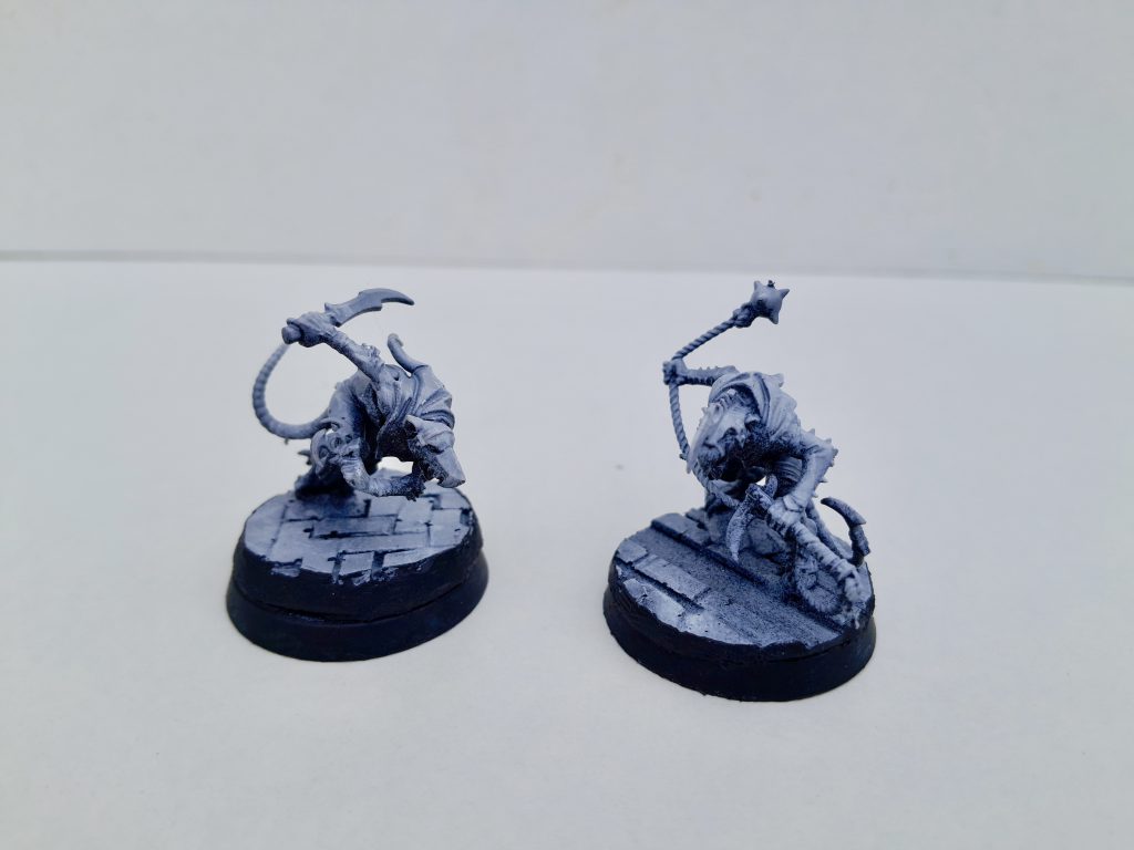 Skaven NightRunners. Credit: @dakarimane instagramI start with a spray zenithal black > grey > white undercoat. This gives a great initial shadows/colour gradient. The next step is to block out everything with contrast paint. Anything going metallic gets a coat of black contrast.