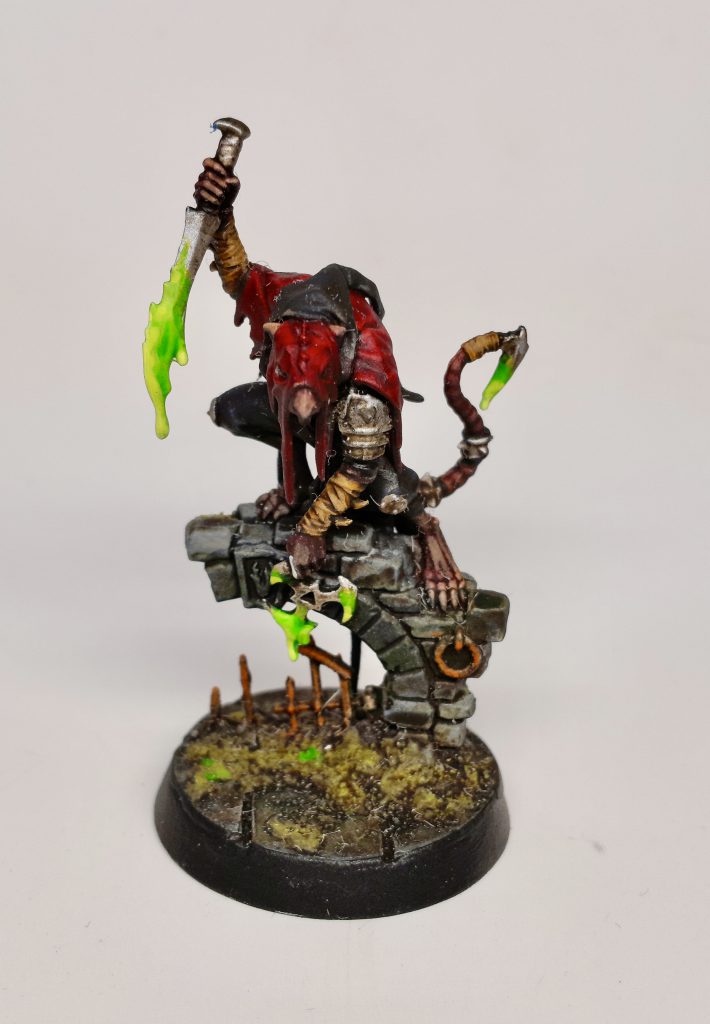 Crixxit himself is, and I think this is important, not noticeably a bigger Skaven than any other -- his lethality comes not from bulk but from his skill at the art of murder, which is beautifully represented by his paired weeping blades and the proliferation of spikes he carries into battle.