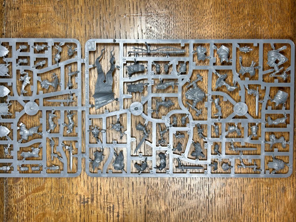 Freeguild Gallants. Credit @badusernametagKnights ho! If you LOVED Freeguild Cavaliers you’ve got a treat here. They have all the juice of their mounted friends, but they’re on foot. Parts are also compatible, so more room for kitbash between the kits. You get a bucket of fancy heads (Snail and Fish my faves!), weapon arms, two options for champions, and a flag.