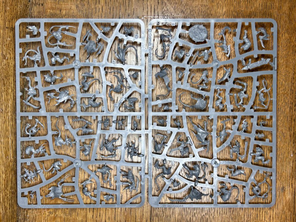 We've got 2 kits in 1 here and they've done a lovely job of distinguishing the Gutter Runners from the Night Runners, the Gutter Runners tend towards longer blades and are cloaked, their champion is also perched on a chunk of under-empire masonry poking out of a gnawbomb portal, while the Night Runners have an assortment of slings, throwing weapons, daggers, roped weapons & wear cowls.