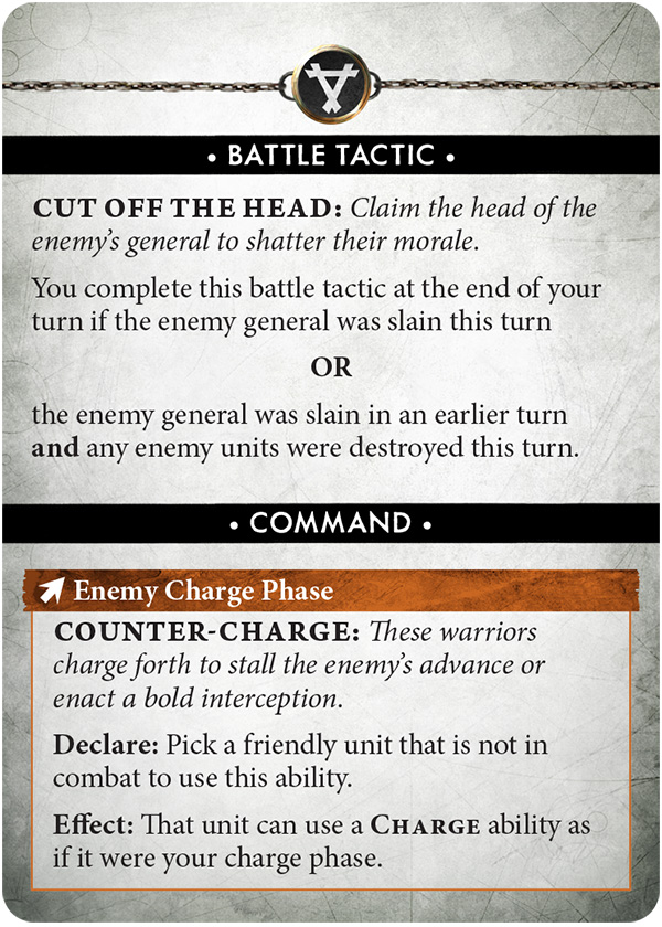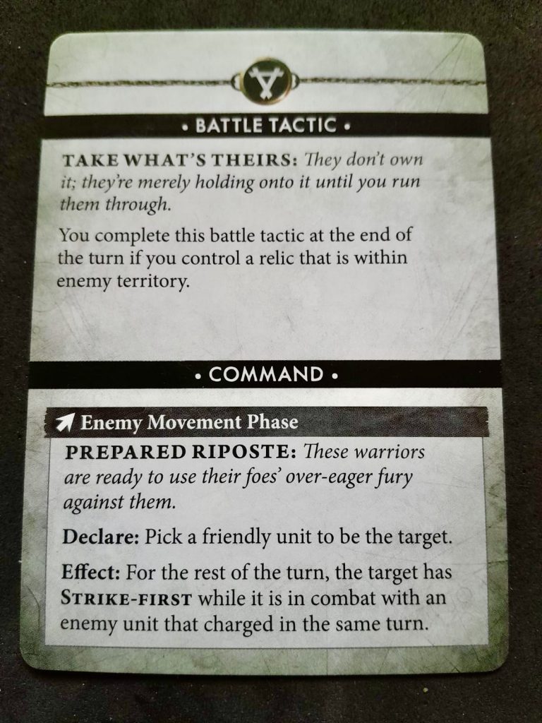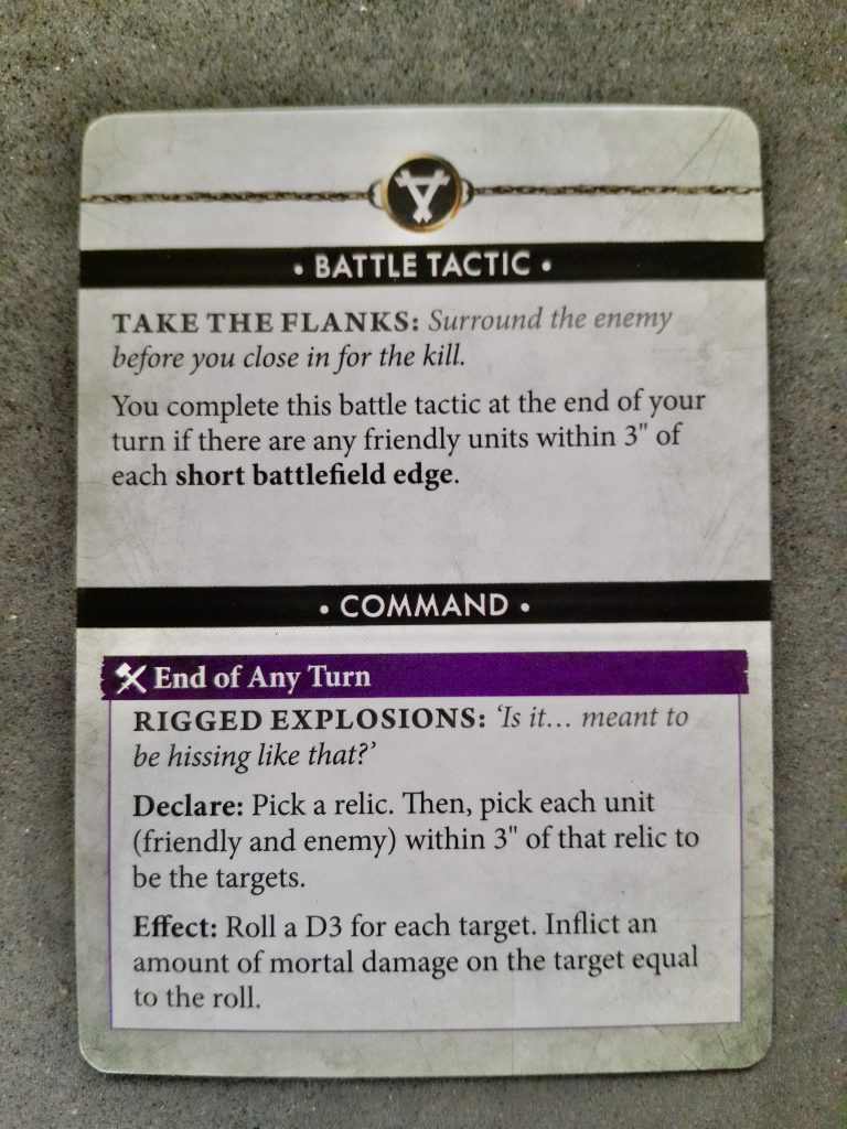 The Battle Tactics are pretty straightfoward here and are mainly repeats from previous. I’m fine with that as they’re solid targets that every army should be able to achieve. Theres some neatening of things though. Cut off the Head for example requires you to destroy a unit this turn if the enemy general is already dead, so you don’t just auto score if you’ve already off’d the general on a previous turn. There is a general move towards the cards referencing Relics over objectives here (other than a couple of exceptions), which as I said before further distances the Battle Tactic scoring from the Objecitve play.