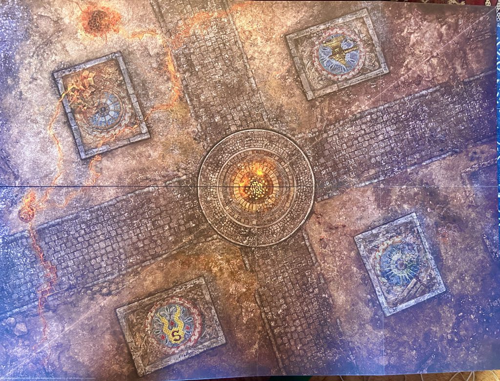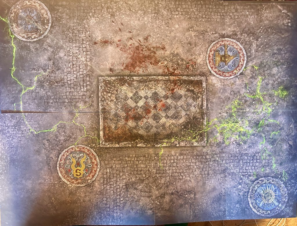 Ashen BastionFirst off I must say these are lovely, with really nice design aesthetic that really obviously sells the ‘ruined city destroyed by cataclysm’ theme. Love it. Designing the objectives in as incorporated terrain features is such a nice touch and really ties the rules into the boards. Its a great move. Circles on the floor are mosaics? Clever and helps with the immersion and theme of it all.