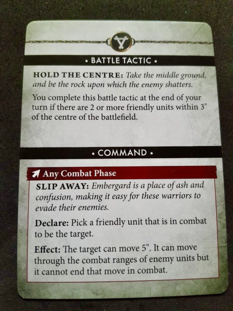Dakari-Mane’s sneaky Skaven like Rigged Explosions as a command that punishes all units at the end of a turn for being near an objective, as well as Slip Away, which allows you to make a hasty retreat from combat before the axes start swinging. Prepared Riposte activates in the enemy movement phase (appropriately) giving you enemy notice that they will struggle if they charge a certain unit this turn. This is one of my faves and I think Strike First is very powerful in Spearhead.