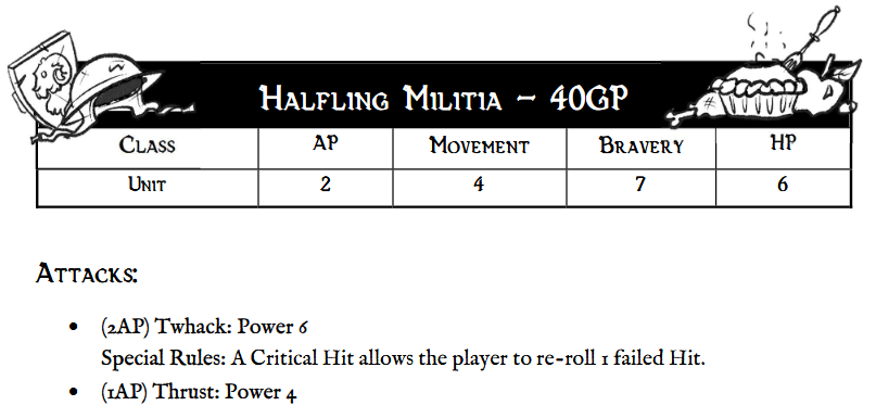 One thing that I really like is that it's open to interpretation what the weapon is with no important differentiation between slings, bows, or crossbows. Or anything else you could imagine, maybe your halfling loves throwing pies or sandwiches or something else! It's all the same. Since no feat type is stated it just needs an easy feat to use. If our Halfling Militia model above was firing it then you could choose to use one Action Point at a time to attempt to fire it twice, and if you get lucky do some serious damage at range! Some weapons don't allow you to use them more than once per turn, in which case you'll want to use more Action Points to help guarantee that attack hits home.