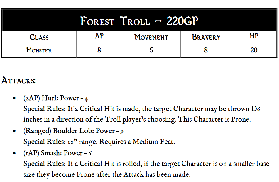 This big guy is going to cost you 220 gold pieces, a fair bit more expensive than our Halfling above, but with four times the action points to use, a bit faster movement (and on a bigger base that goes further, too) as well as higher bravery and more than three times the number of hit points. Definitely going to be a bit harder to take down! We'll get to what a Medium Feat is below for a ranged attack. You might have noticed that those melee attacks are the same exact power as the Halfling, which makes sense since the Troll can use them many more times in a turn, but will also notice that the Critical effeects will knock characters on smaller bases prone or even hurl them away!