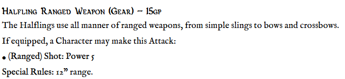 Shooting is done with the feat system, most often needing an easy feat to succeed and once you have succeeded then you get to roll the weapon's power for attacks. Every faction has their own version of a ranged weapon that models can purchase and will differ slightly as is appropriate for the faction. Let's look at the Halfling Ranged Weapon: