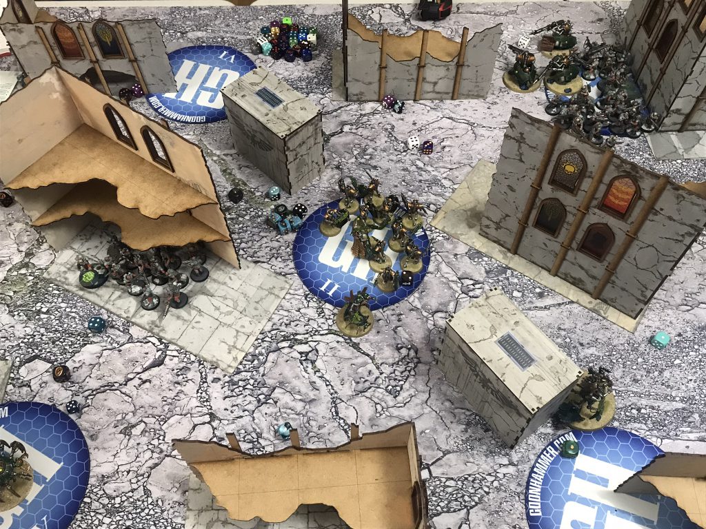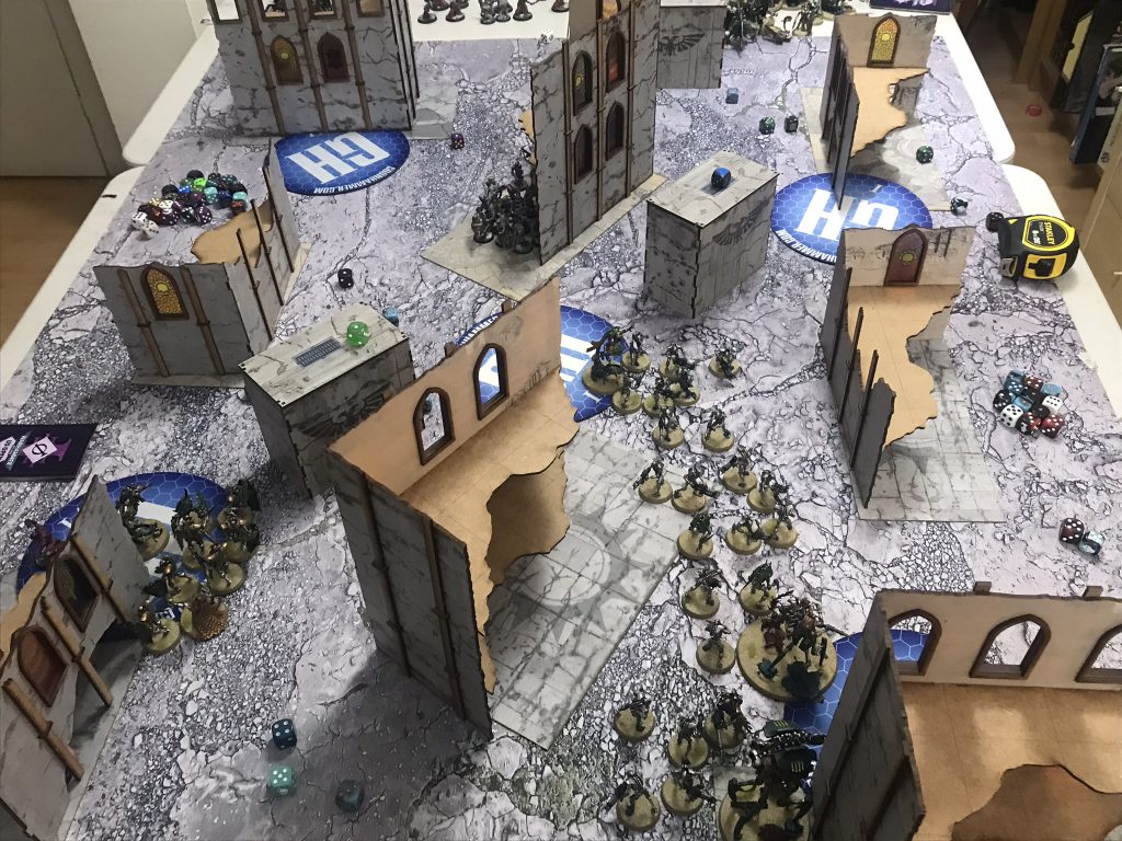 GHO UK Day 2 map with Bandua terrainFinally, of course, some action shots - myself and Lowest of Men got together in the Competitive Innovations bunker and pitted our Necron and Genestealer Cult armies against one another across an earlier version of the above layout.