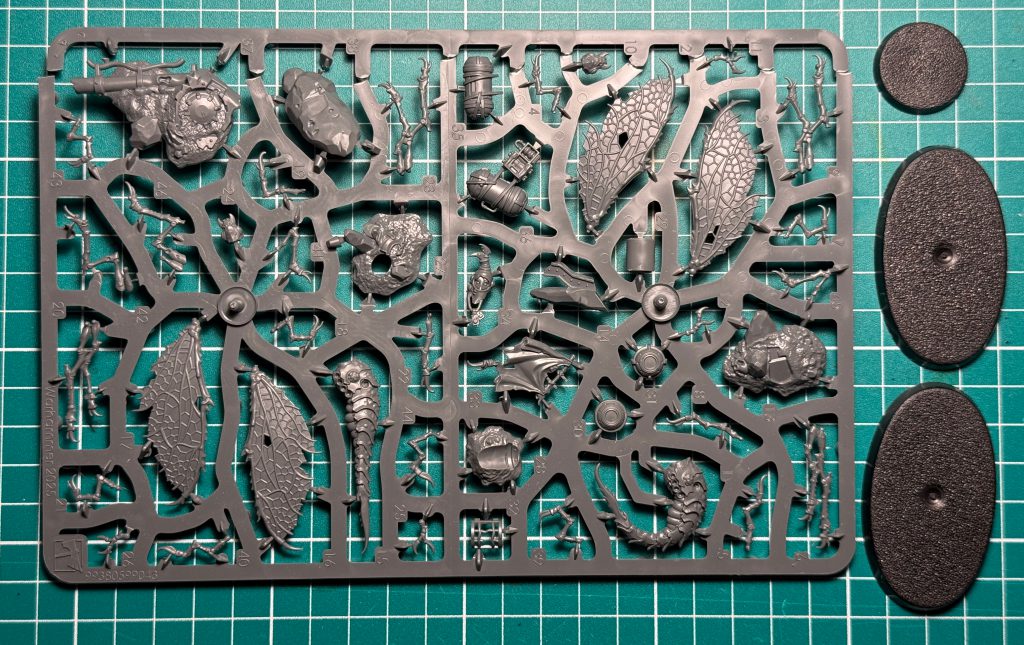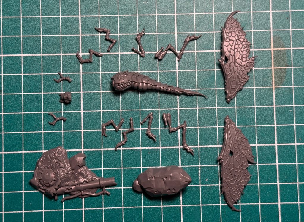 I only assembled one Ashwing due to time constraints. What did I learn? It's 16 parts for the one bug. Build the base first. Dry fit everything. And as you glue the legs on, especially for the one standing on the rock, take care with the leg placement. Turns out it matters and you'll need to glue the legs to the body and base at the same time. I didn't realize this, but I guess I've built enough kits to check and I'm glad I did.