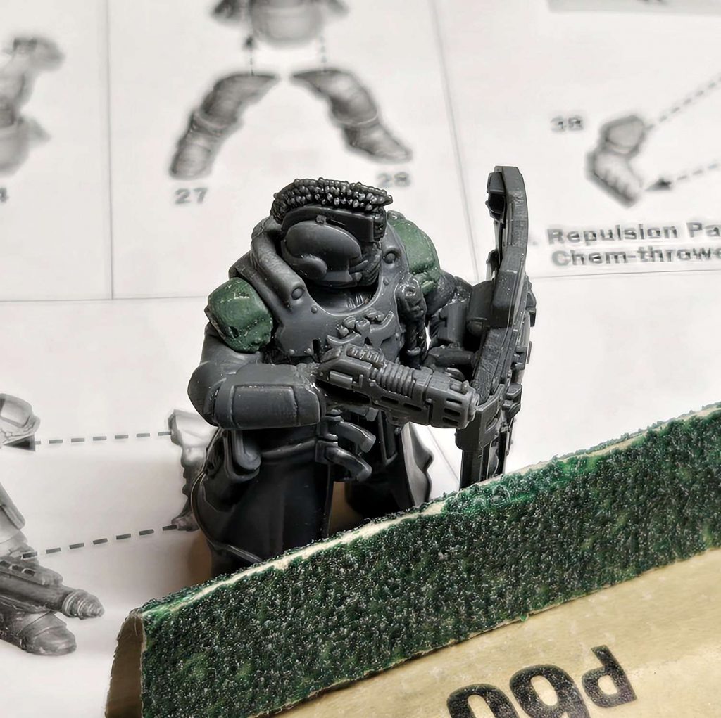 Subjugator Sergeant. Credit: FowlerThe Subjugator Sergeant build has two options - one with the new chem-thrower and one with a heavy stubber. I tried a few old Subjugator arms on the Sarge torso and it seemed like the opening was smaller. In this case, I wanted to use the new arms for both builds - but if you want a sarge with a shield, you may have some conversion work ahead of you. You would likely just need to shave off some excess to get them into the shoulder holes.