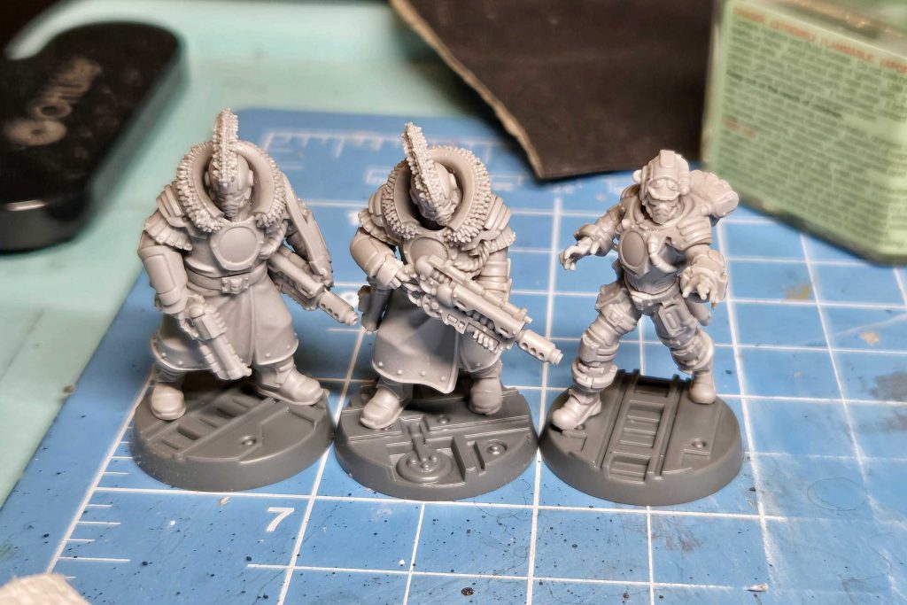 I've been looking forward to the Palanite Companions kit for a long time. A pair of badasses with dusters and horrifying guns. The builds were pretty straightforward. One pitfall here - the Companion with the gun across his chest will get in the way if you are trying to do a transfer there. I would recommend leaving that bit off if you plan to freehand or apply a decal. I am in the early stages of painting these, but fair warning that there are a lot of details in close proximity around the head / neck / cuff / etc. Even when I was going slow and being careful, I got a fair amount of paint in the wrong spots. Take your time!The Enforcer Haunt build was mostly fine, but did have some nightmarish bits. The hoses are extremely small and brittle. One was already broken, and broke in other places when I tried to salvage it. I left one tube off, and in hindsight would have just clipped the tubes off of... whatever things on the legs they are connected to. I stuck it out as I really want to run a haunt in my next Enforcer gang.