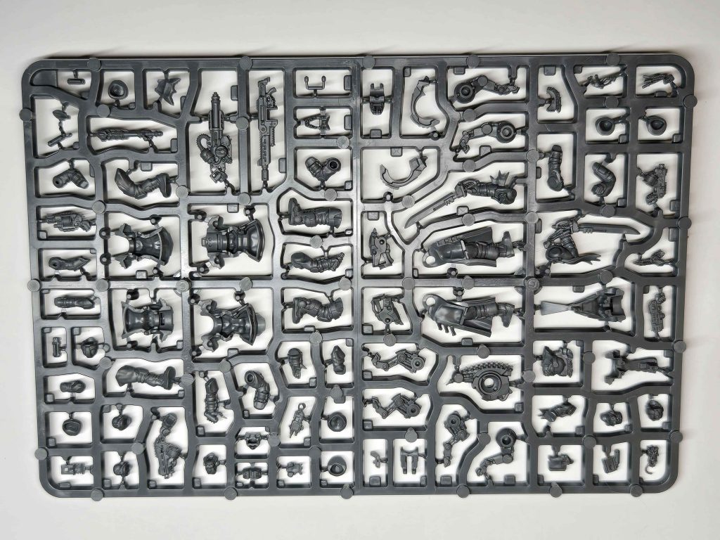 Palanite Enforcer Captain Upgrade SprueThe upgrade sprue is great. With non-Subjugator enforcers getting access to riot shields, it's great to see the bit show up in here. Each sprue has a right and left-handed option, with two sprues in the box. Other notable inclusions are an at-ease long rifle, a two-handed concussion carbine, a web gun, and a flamer. Close-quarters enthusiasts can enjoy a pile of autoguns, power knives, and shock batons. The five new heads are a welcome addition as well.