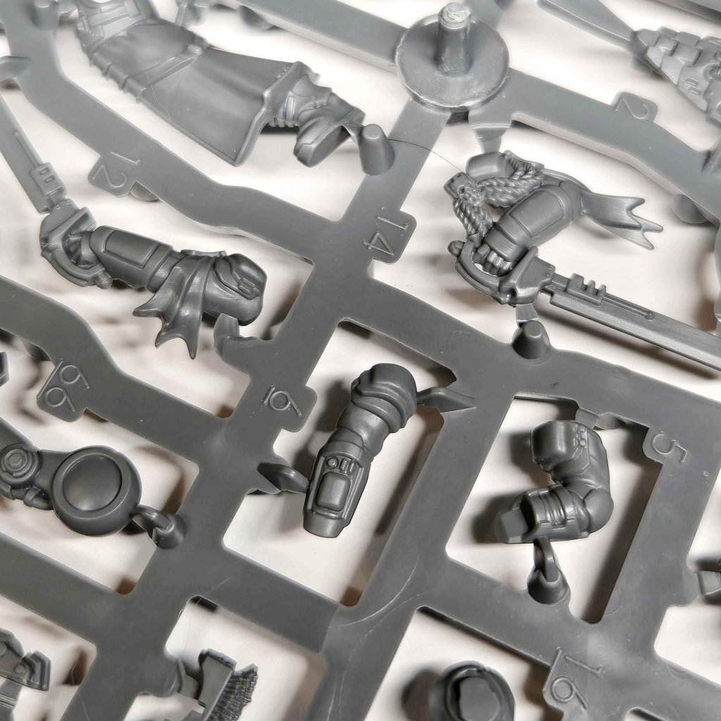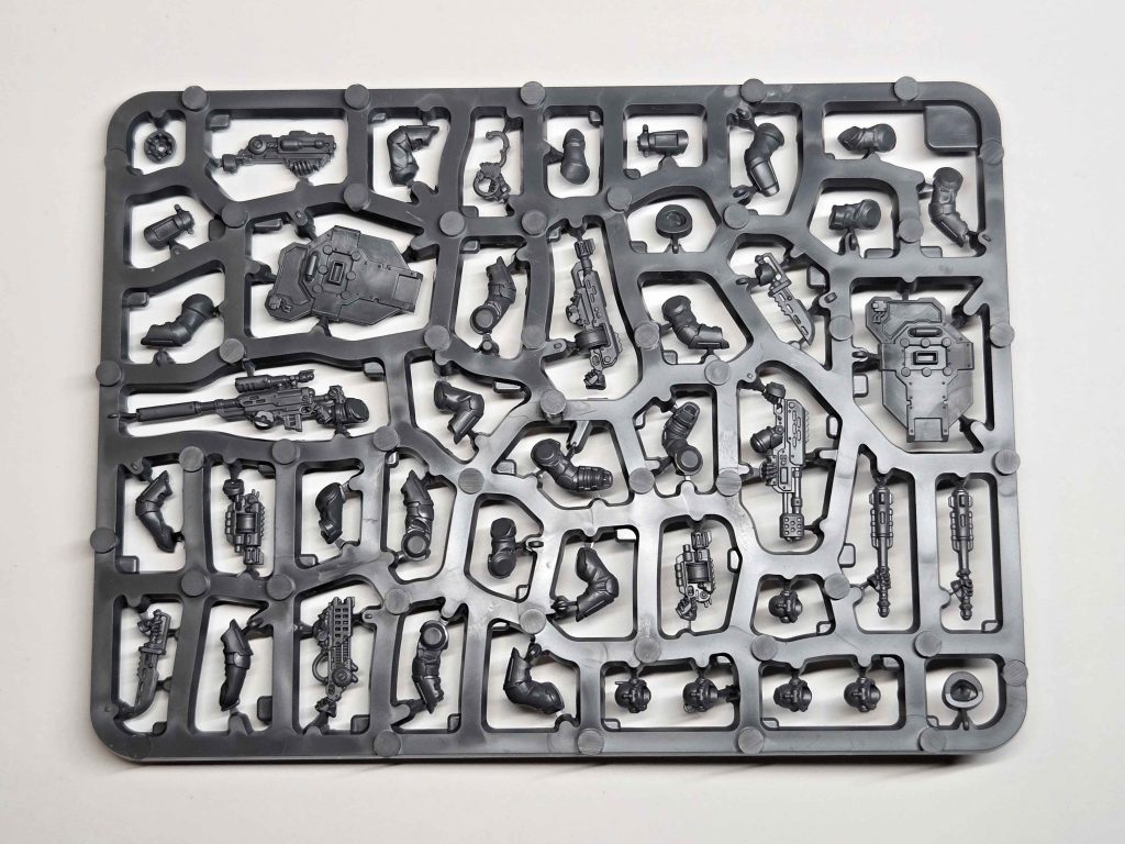 Palanite Enforcer Captain & Sergeants SprueCaptains only have a few options available in the kit: pistols (bolt or plasma), along with an unarmed left hand or two different power sword variants. My dream was to have a plasma pistol and riot shield captain - using options in the upgrade sprue and a pistol from the Captain box. The lack of molded shoulder pads on outside arms presented a serious problem - how do I make other options look good?