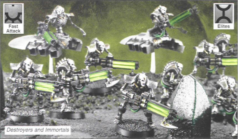 TheChirurgeon: The Necron army list got a complete overhaul at this point, more than tripling the size of the army and turning them into a real force. Previously, the Necrons only had 5 metal unit options: Lords, Scarabs, Warriors, Immortals, and Destroyers, and the models for these were… not GW’s best work, let’s say. They had a very 2nd edition aesthetic, particularly the Destroyer, which was just a Necron on a flying sled. The new release saw every one of those replaced.