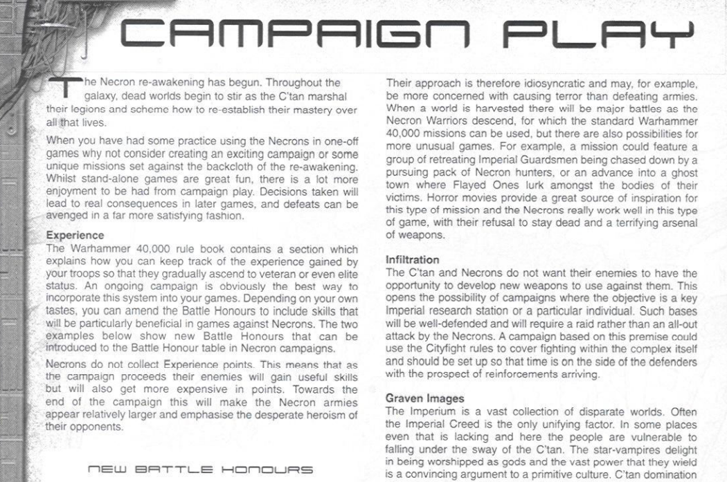 Campaign Play. A lot of these third edition concepts would later be reworked into Crusade.TheChirurgeon: Yeah the “Campaign Ideas” section at the end of the book is an oddity, even for 3rd edition codexes. The third edition rulebook had introduced some rules for playing campaigns and mission structures, and that got sparing support throughout the edition, with more showing up later on as supplements like Cityfight were released. It’s a cool section to have, and it feels more than a little like a stealth way to tie in the new faction to the then-nascent RPG, Inquisitor.