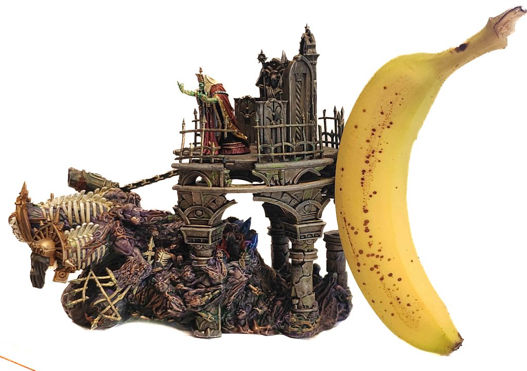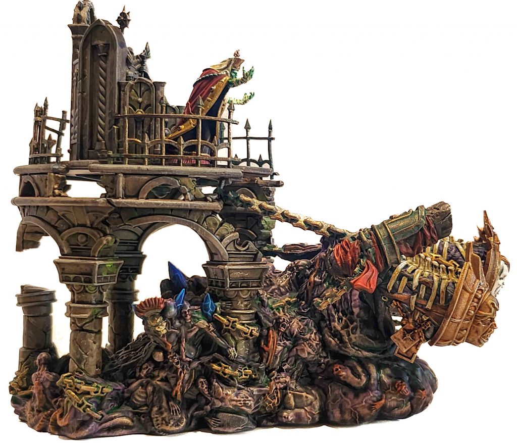 Theokrator - Credit: DeadlytroutAll in all I found this model a real easy build; there are some parts, notably iron railings, that are slightly prone to a snap but this just adds to the whole “ancient ruin” vibe with the rest of the model being solidly stable and capable of some reasonable battering. It took around two hours start-to-finish to build it up with only minor distractions of “how to paint ancient stone” slowing me down. As mentioned, the painting was fun, if a little repetitive with the sheer amount of stone and generic “flesh” but the odd little gory detail and incredibly fun tri-face frontage more than made up for it. I’m really happy with how this model acts as both a leader of the army, and as a hobby piece. I’m excited for the future to see what forsaken conversion opportunities are born from this beautiful monstrosity.
