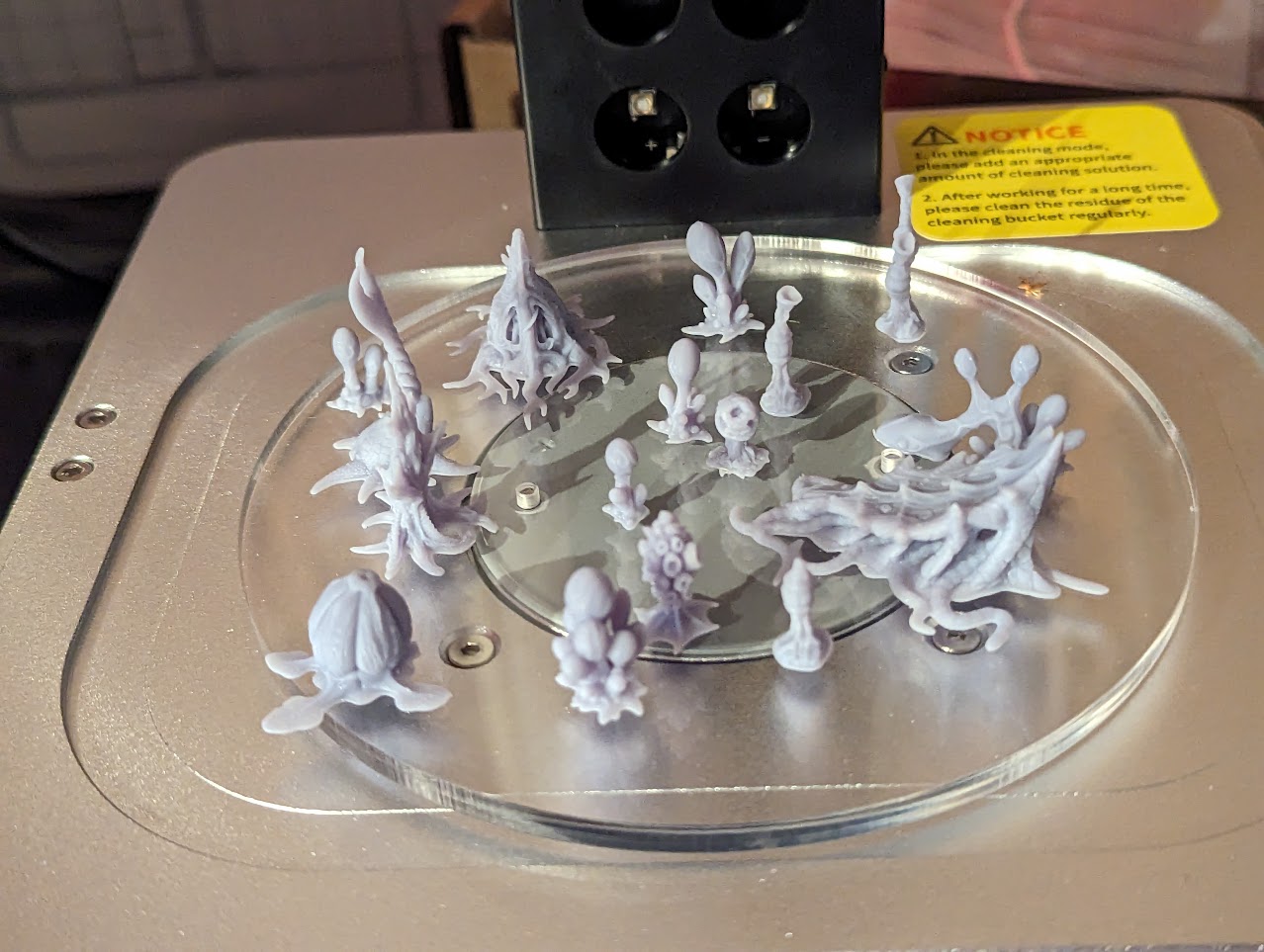 Alien Plants printed on Elegoo Mars 3 Pro 4K. Models are from GrimGreeble on Cults3D.Finally I put together a bunch of small alien plants for my Tyranids. The models come from GrimGreeble on Cults3D, and when compared to the same models printed on my original Photon the difference is insane. There are simply no visible layer lines, details are incredibly crisp, and it took absolutely no effort at all to print them. The build plate of the Mars 3 is sandblasted to maximize grip, but you will want to be careful using scrapers (particularly metal) as over time it can damage the surface when you try to remove parts. The best way to avoid this is to use disposable plastic razor blades and add chamfered rafts on the parts so that it can easily be popped off.