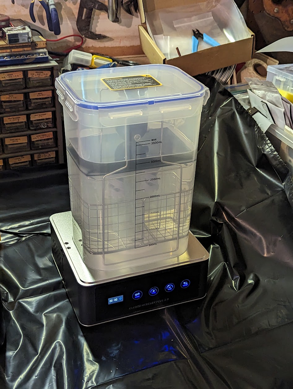 Elegoo Mercury Plus V2.0 in washing mode.For the washing configuration you take the gasketed vat and fill it with high proof isopropyl alcohol. The printed parts are either dropped in the basket, or kept connected to the base and place inverted as seen in the picture above. When in wash mode the motor in the base will rapidly spin the agitator in the vat and wash away any excess resin. The manual didn't contain any guidelines on timing, but I found that 10 minutes is more than enough. After time is up you remove the part or plate and allow it to air dry. Elegoo says that the washing liquid is good for up to 30 cycles, at which point it should be decanted into a container that can be left in the sun to cure. The liquid sitting on top of the cured sludge can then be re-used; the sludge is left to cure fully and then disposed of as general trash.
