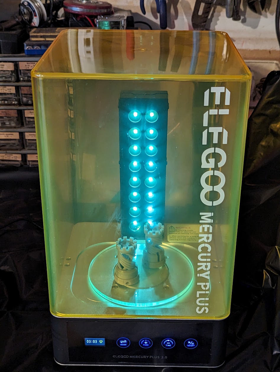 Elegoo Mercury Plus V2.0 in curing mode.In curing mode you replace the vat with the clear plastic plate. The screw heads of the disc align with depressions in the spinning motor, and the dried parts are placed on top of the plate. Once the UV shield is put in place you run the curing cycle until the parts are cured. As with the washing mode the documentation doesn't provide a recommended time, but 10 minutes seems fine. Once the time is up you can check that everything is cured, and then your parts are done.