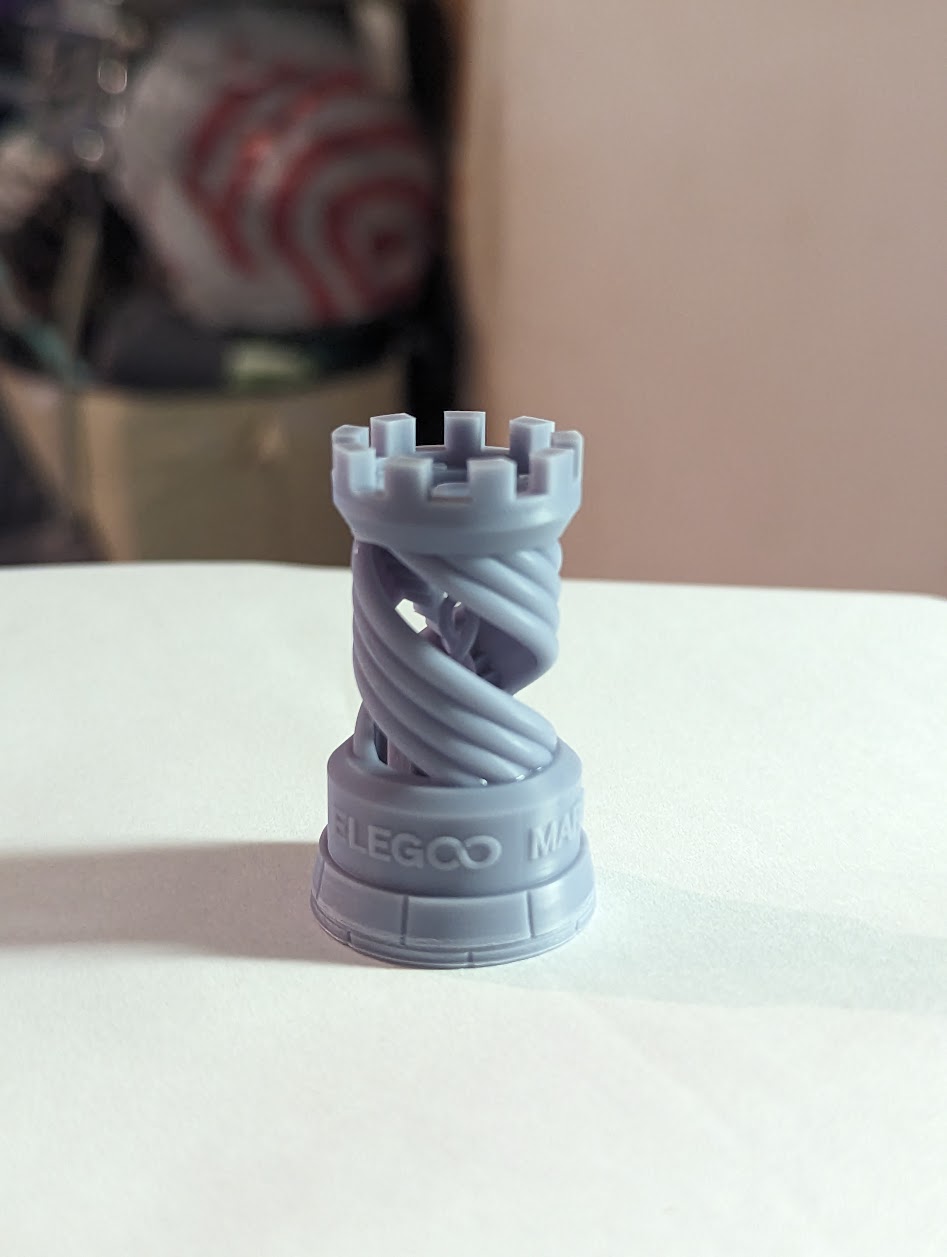 Elegoo Rook printed on Mars 3 Pro 4K.My first print was the default rook model, and I was immediately blown away by how smooth the print was. The thick base easily popped off the base plate, and you can see in the image above that detail is crisp and edges are sharp. This shouldn't be a surprise given that this is the default model provided by the company, but it's a good example of what kind of quality is possible.