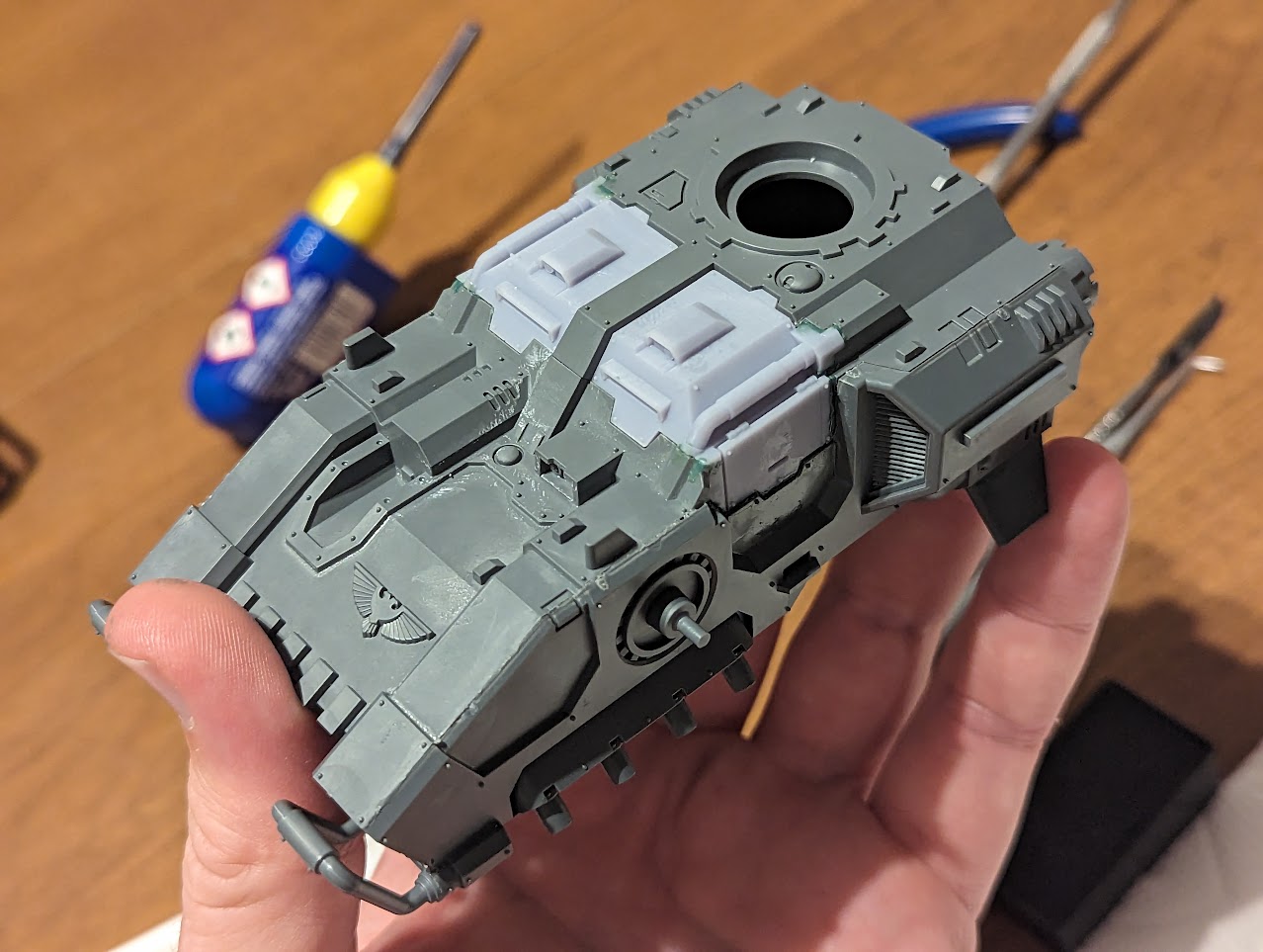 Games Workshop Storm Speeder with covers printed on Elegoo Mars Pro 4K. Cover models by Gotrek on Cults3D.The second model I printed was a series of covers for a Storm Speeder modeled by Gotrek on Cults3D. I used the default settings in Chitubox and the print came out great. You can see in the image above that the quality of the build in terms of smoothness and detail coincides very nicely with the appearance of the injection molded plastic. There were some fit issues and gaps, but that's to be expected and isn't a function of the printer quality.