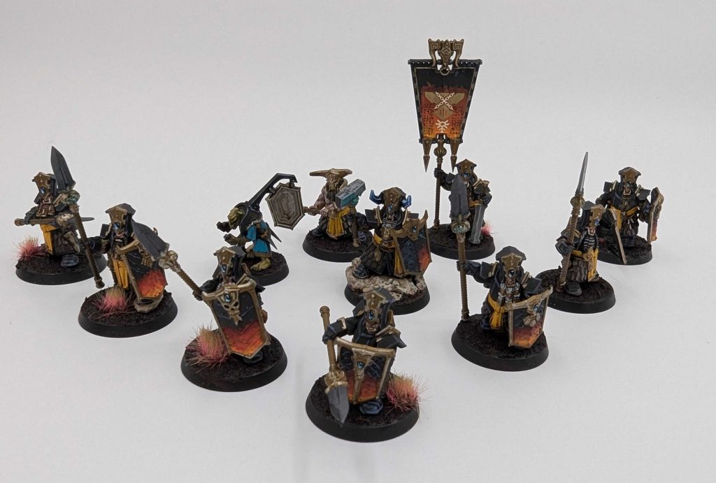 Infernal Cohort with Spears - Credit: MildnormanYour battleline infantry are your Infernal Cohort, which come in two flavors, spears and blades. Both versions have the same statblock with a 4” move, a 3+ save, 1 wound, and 1 control. Both have a very similar offensive profile too, 2 attacks each at 3s 4s no rend and 1 damage, with the spears having anti-cavalry and anti-charge while the swords only have anti-infantry. Both have a gong carrier token which gives you an extra rally die once per game and the same Power Point ability, giving them a 6+ ward, 5+ ward, and then 4+ ward to spells and prayers at 1, 2, and 3 points respectively. Where they diverge significantly is their third ability. The sword variant has Disciplined March which makes a run roll of less than 4 into a 4 any time they run. This is nice for getting your slow tough infantry into position early. The spears on the other hand let you roll for each objective you control that they’re contesting and on a 3+ put a Power Point on a nearby unit. That ability makes the spears the default pick in my mind, allowing you to juice up your important units early.